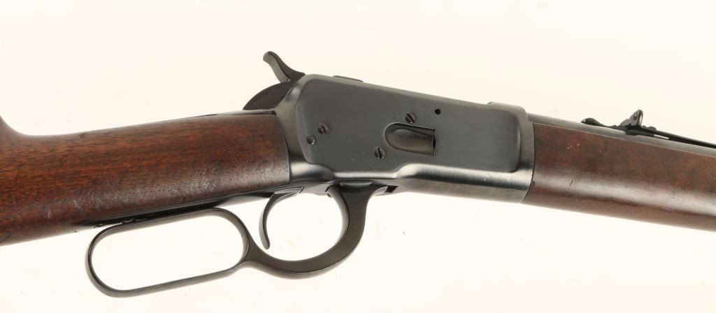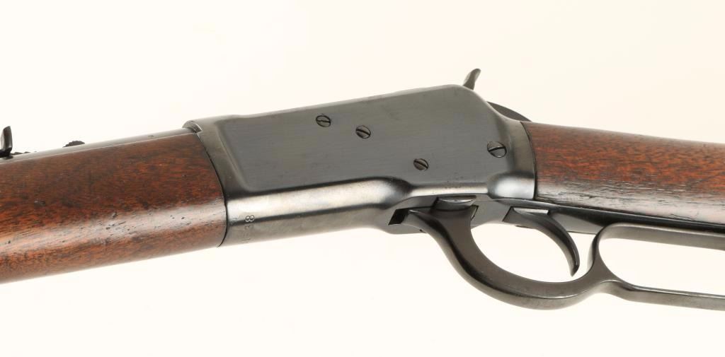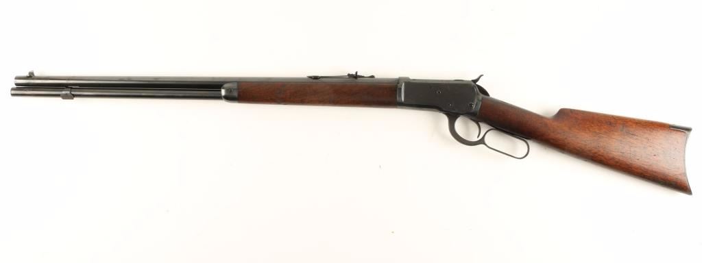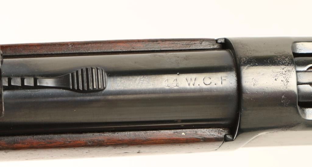 Blued lever-action rifle made in 1896 with a 24-1/4" barrel, ramp adjustable rear sight, wood stock and crescent buttplate. Bluing is refinished over buffed metal with some areas of pitting on barrel and receiver. The magazine ring dovetail on the bottom of the barrel is not retaining the ring well. Bore has pitting with worn rifling. Action is smooth and works well. Wood is dark, fits the metal well but has dings and rubs with a few small slivers missing from the upper tang. Condition as refinished antique is good. *Antique Firearm*