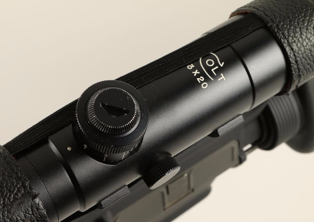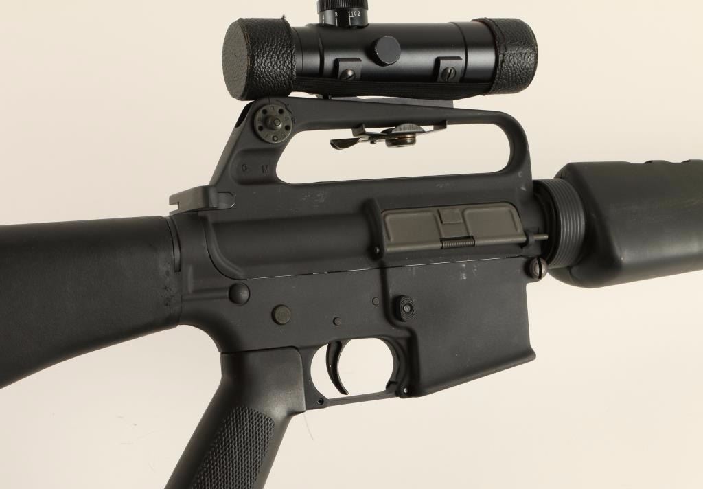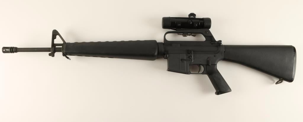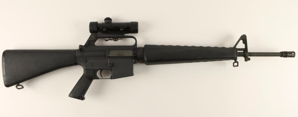 Gas-operated semi automatic assault rifle chambered in .223 Remington, circa 1980. Features a grey parkerized, 20" chrome bore barrel with bird cage style flash hider, Colt fixed power scope with leather covers, adjustable A2 winged front sight with bayonet lug, dual aperture rear sight in carrying handle, triangular hand guard, checkered black plastic pistol grip, no magazine, safety selector, sling swivels and a black composite shoulder stock with trap door. Finish shows only few scuffs from handling & storage. Action is strong, bore is very good with some debris, and stocks are fine. Condition is excellent. ***Modern Firearm***
