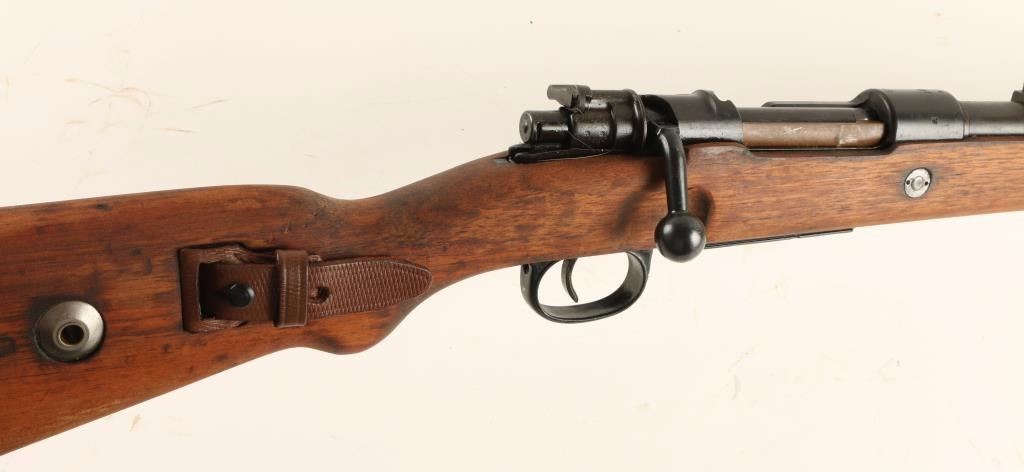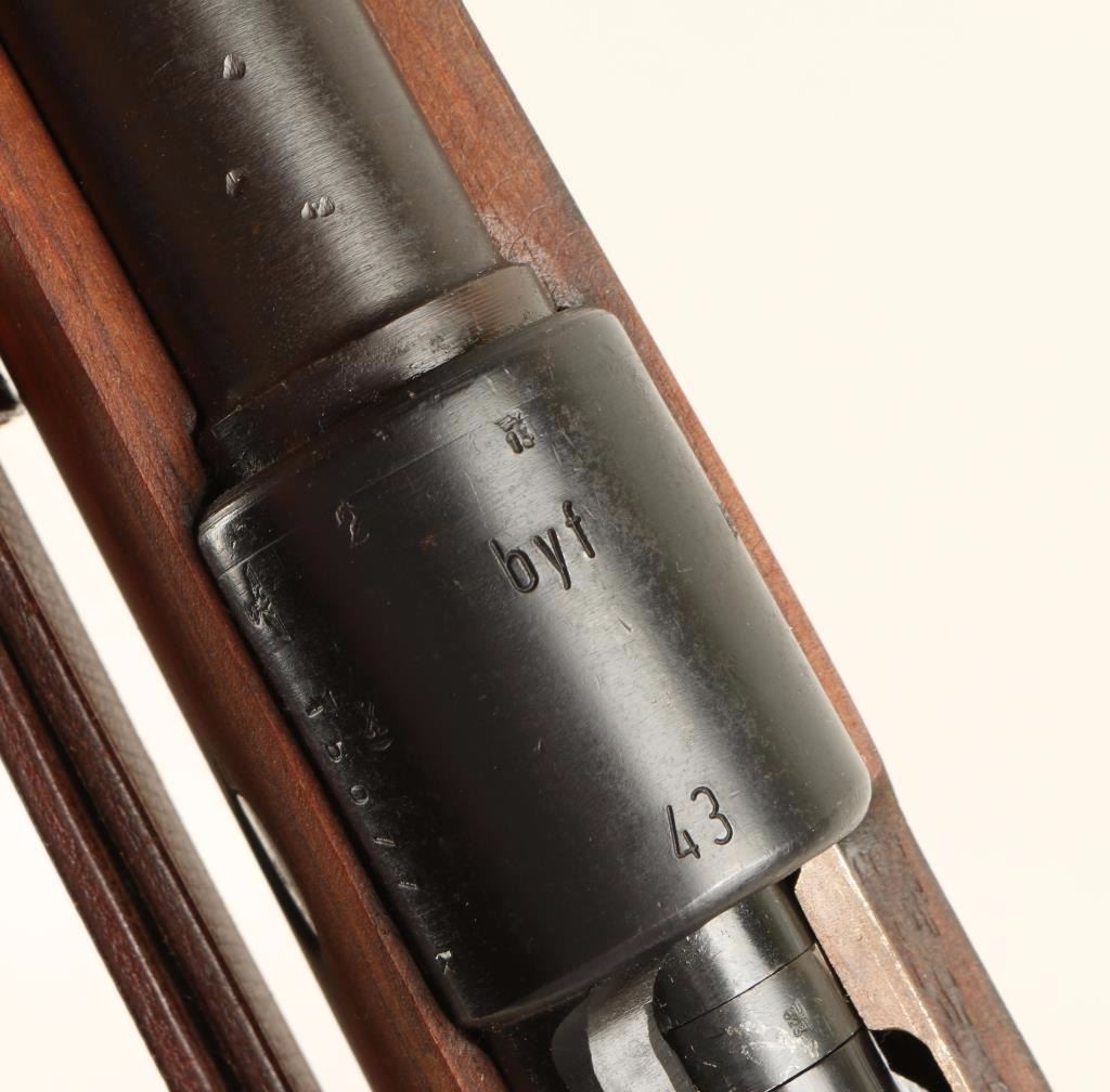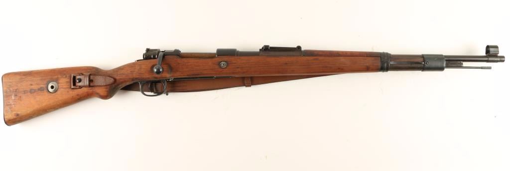 Blued bolt-action German military rifle made in the "byf" (Mauser Oberndorf) plant in 1943. Has the TG Knox import marks, 23-3/4" barrel, mismatched serial numbers, cleaning rod, modern leather sling and wood stock. Bluing is good with electro-pencilled matched serial numbers. Extractor is rust brown in color. Bore is shiny with good rifling. Action works well. Wood has been sanded and is bare with sharp edges and is lower than the metal edges. Has new waffenamt stamps in butt. Condition is good to very good as refinished *Modern Firearm*