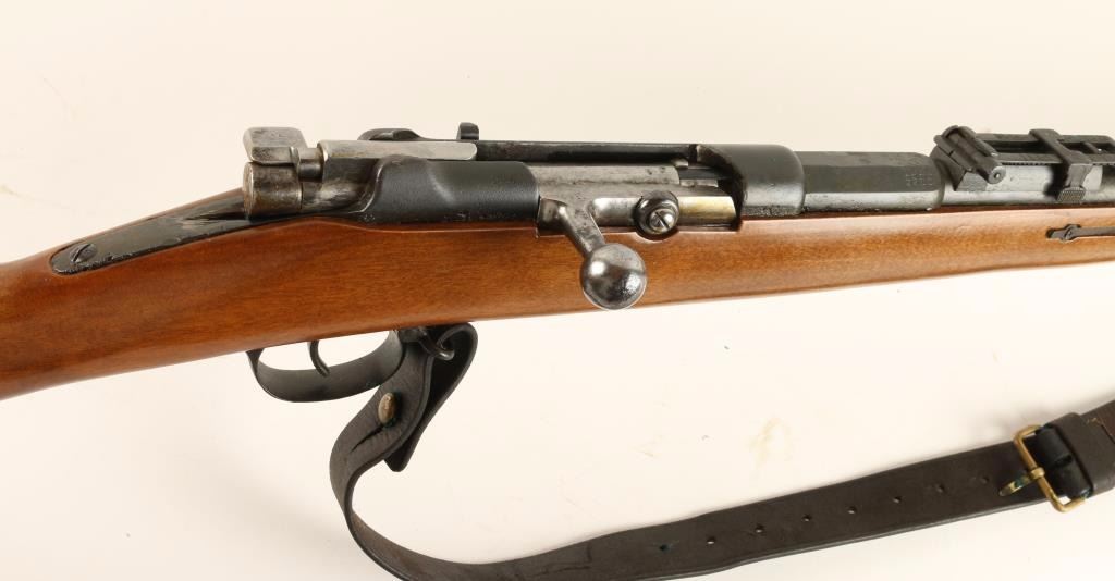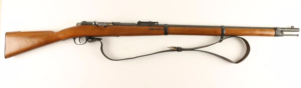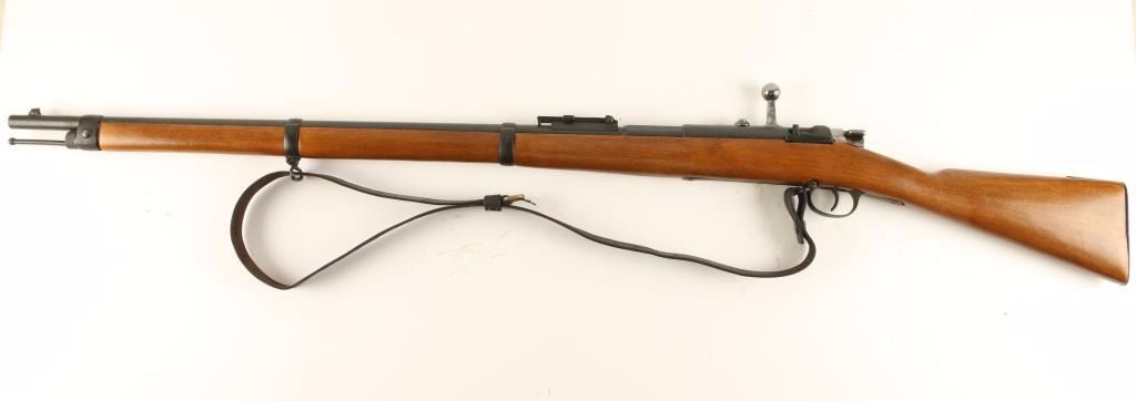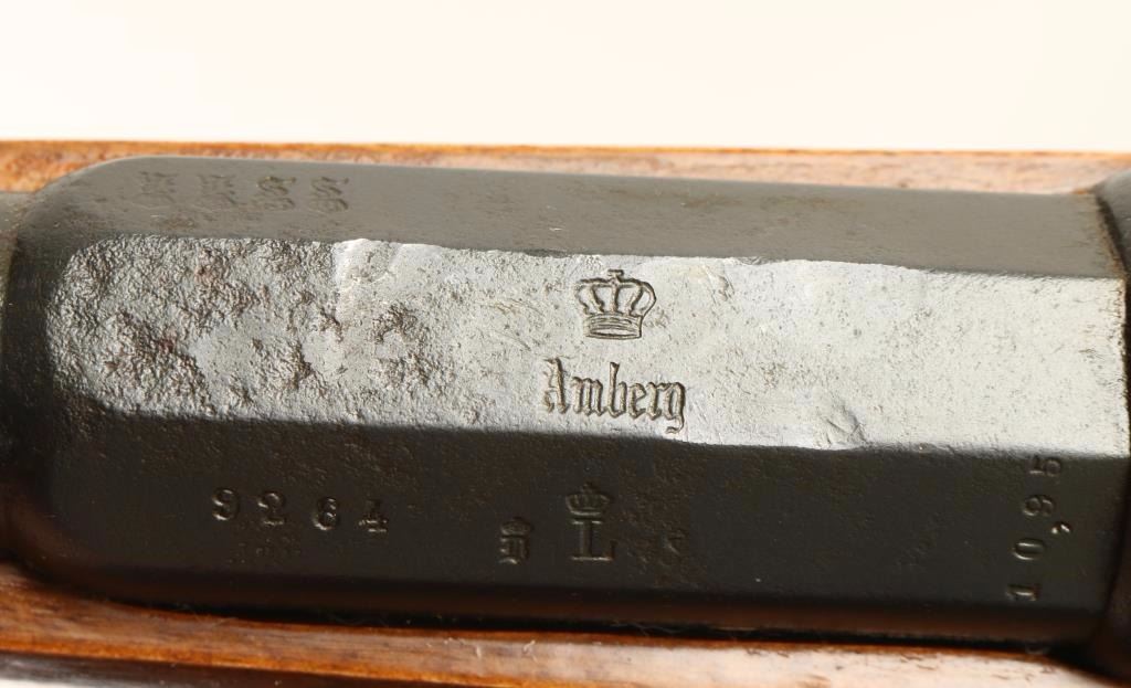 Blued bolt-action single-shot German military bolt action made at the Amberg arsenal in 1886 with a 31-1/2" barrel, leather sling and wood stock. The receiver and barrel serial numbers match and the bolt body and safety serial numbers match, all others are separate. Bluing is dark over pitting and there is severe pitting along the stock line on the receiver and barrel. Bottom metal has extensive pitting. Buttplate is in good condition with matte finish. Bore is fair. Action is working well. Wood has sharp edges and a few dings and rubs. May be a reproduction stock. Condition is good as an antique. *Antique Firearm*