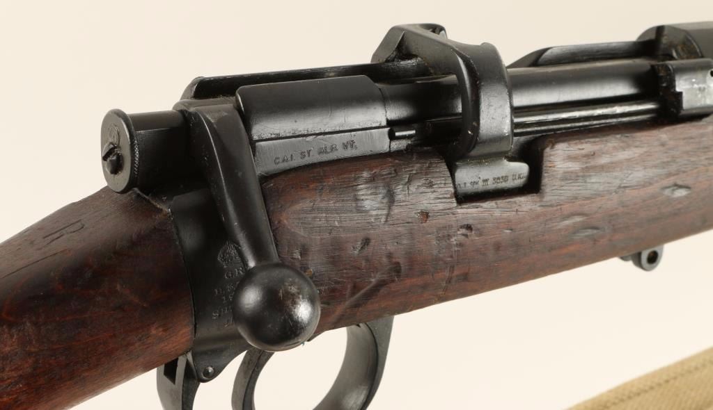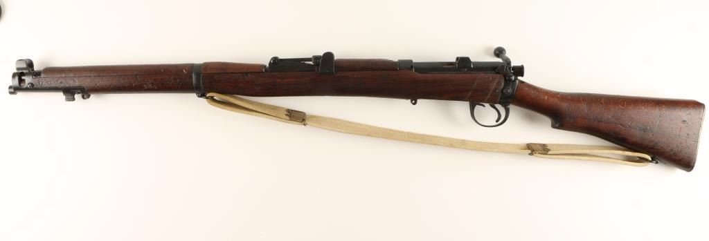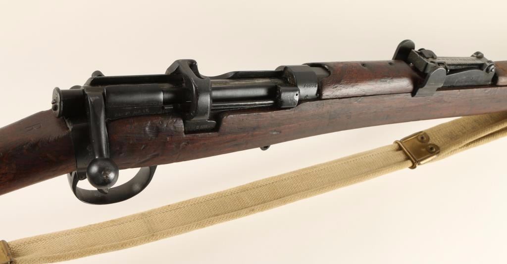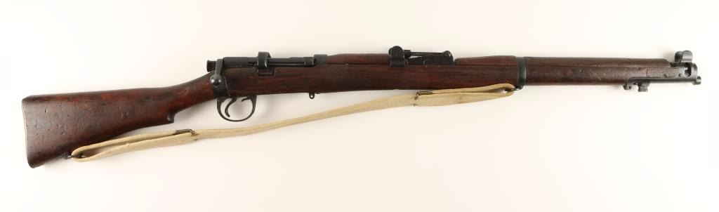 Blued bolt-action British military rifle made by B.S.A. with a 1916 date, a 25-3/8" barrel, matching serial numbers, CAI import marks, no magazine, web sling and a full-length wood stock. Bluing is very good. Bore is frosty with good, shiny rifling. Action works well. Wood is dark with repaired cracks on left side of receiver and on handguard before front sight. Condition is fair to good. *Modern Firearm*