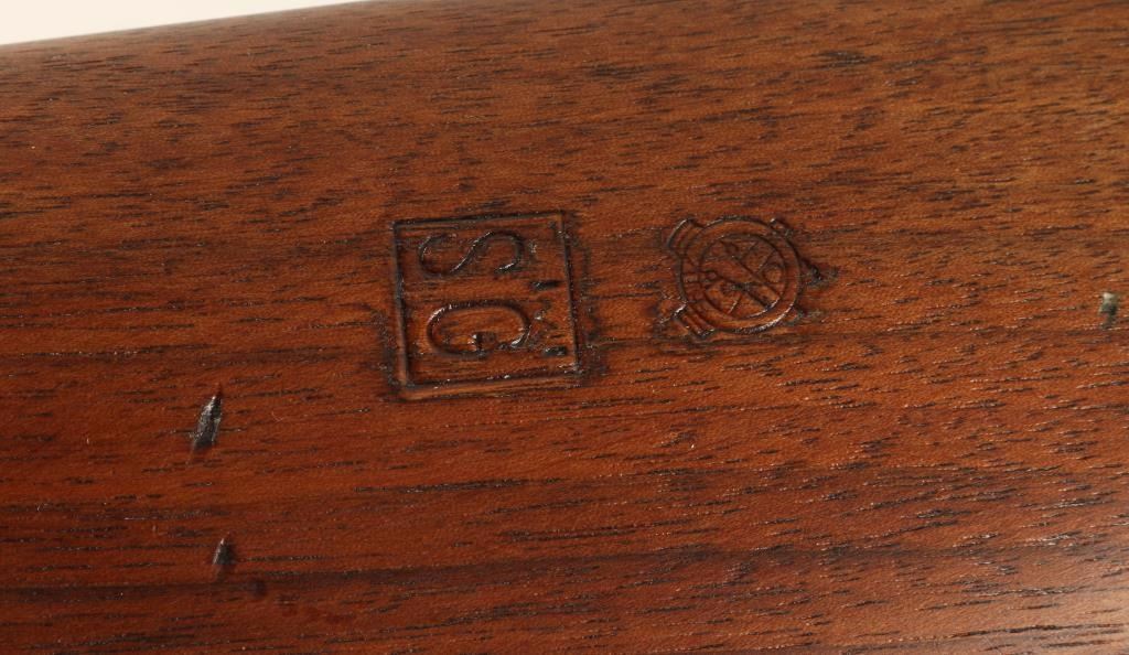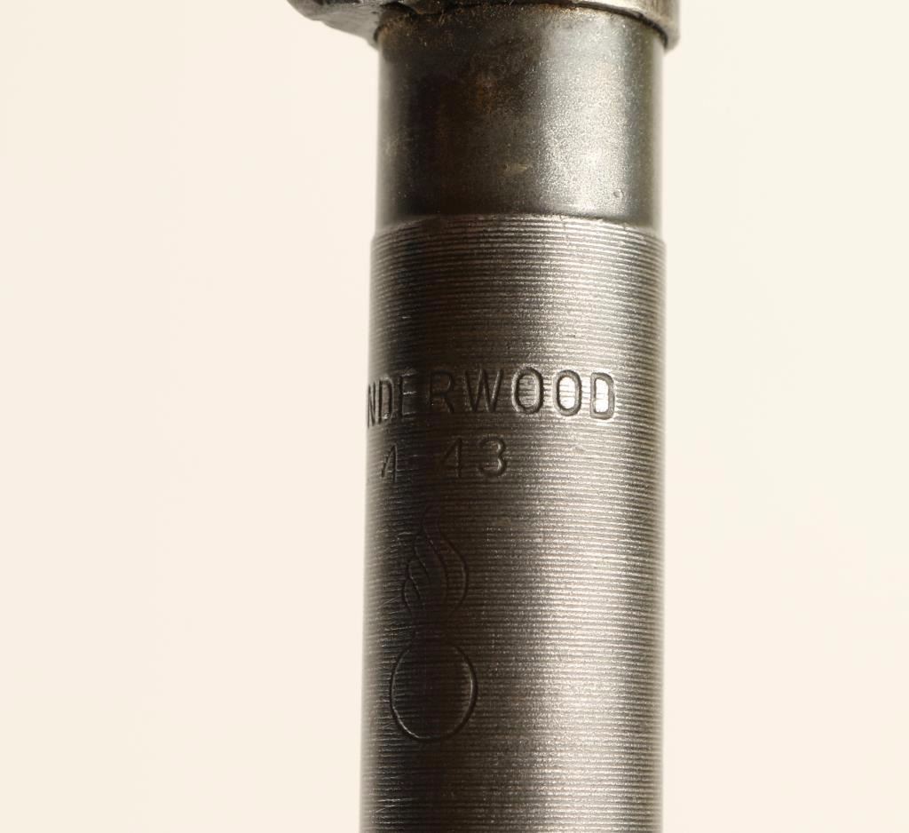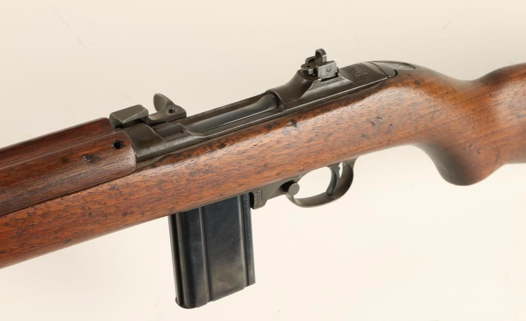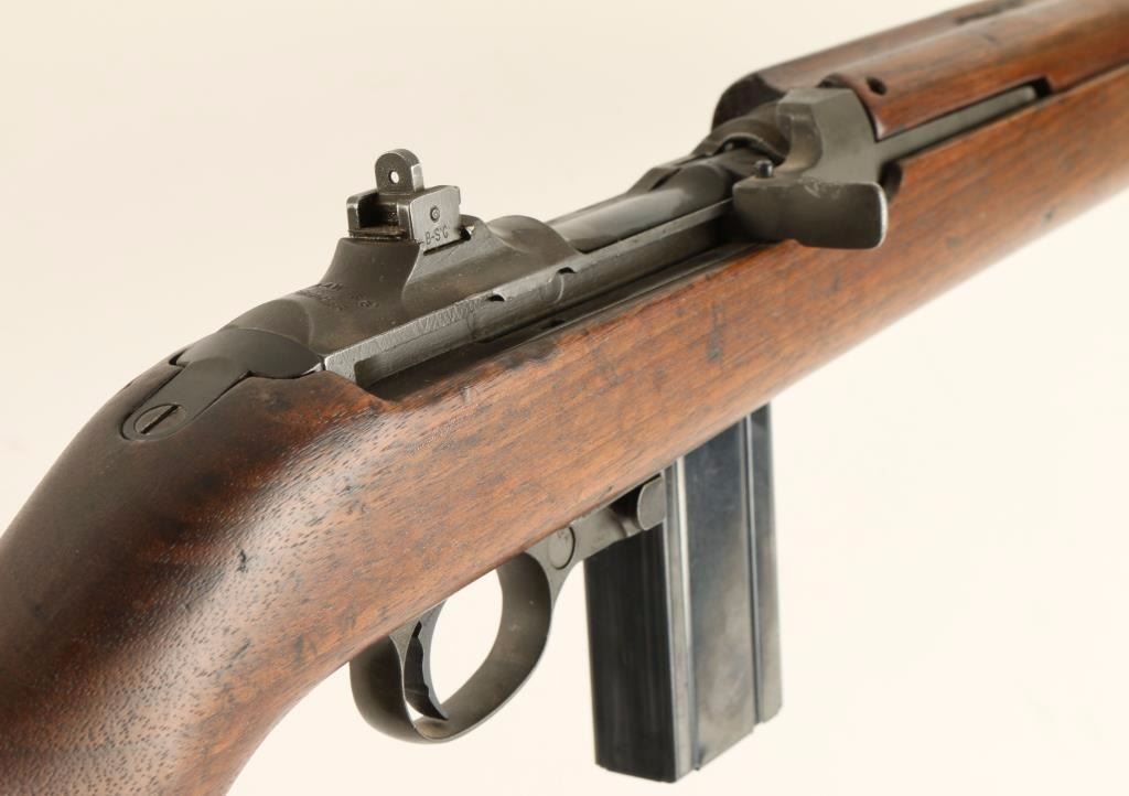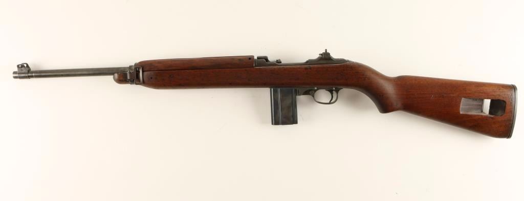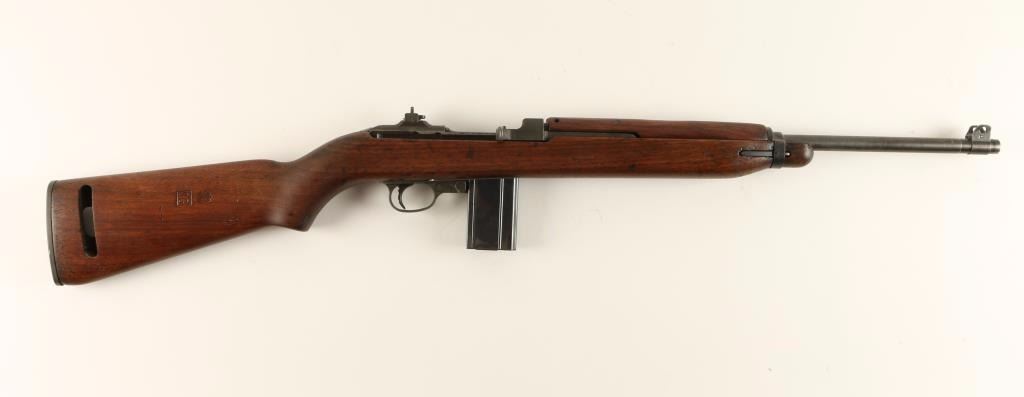 'Grand Rapids, Michigan Production' U.S. Military contracted semi-automatic rifle chambered in .30 Carbine, circa 1943. Features a parkerized finish, 18" Underwood barrel marked 4-43 with flaming bomb, winged front sight, flip-up dual aperture rear sight, slim barrel band with sling swivel, high-wood hand guard with wide groove, oval cut oiler slot, push button safety, 15 round magazine, smooth trigger, flat bolt, and wood pistol grip stock with "S'G" & Crossed Cannons cartouche. Rifle retains 40% parkerized finish with wear from use and storage. Action is smooth, bore is excellent with an area of debris, and wood stock is near fine with few dings. Condition is very good as vintage. ***C&R Firearm*** ***Modern Firearm***