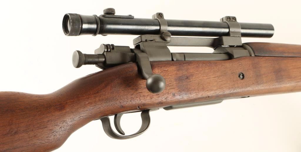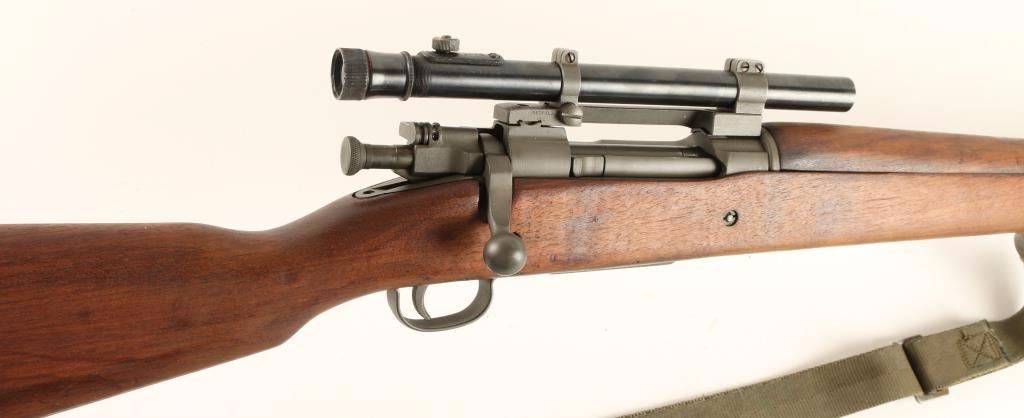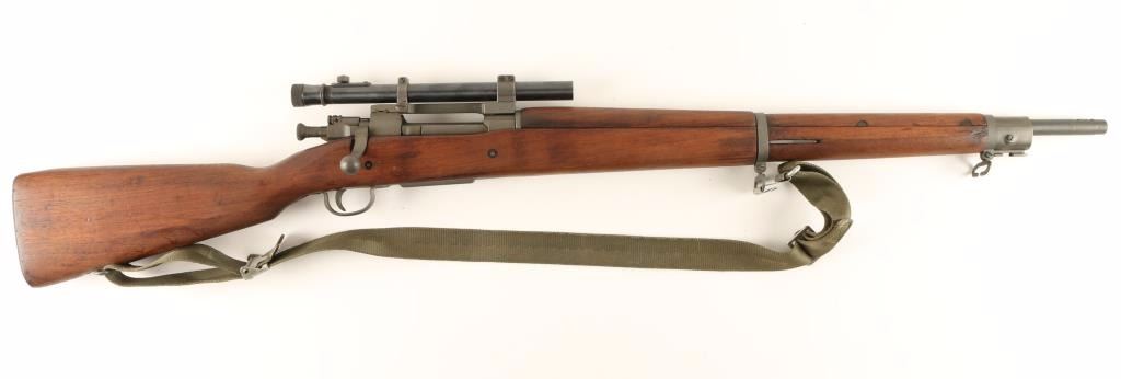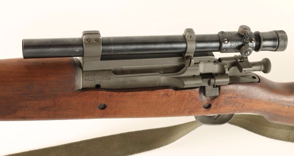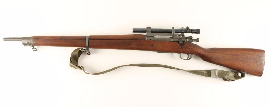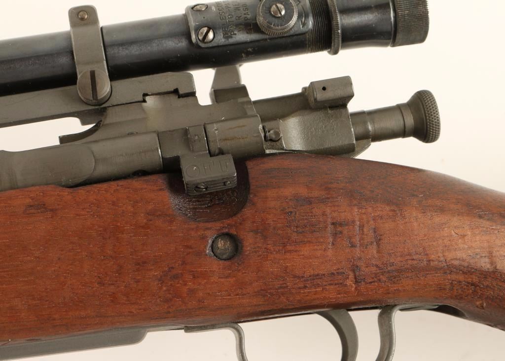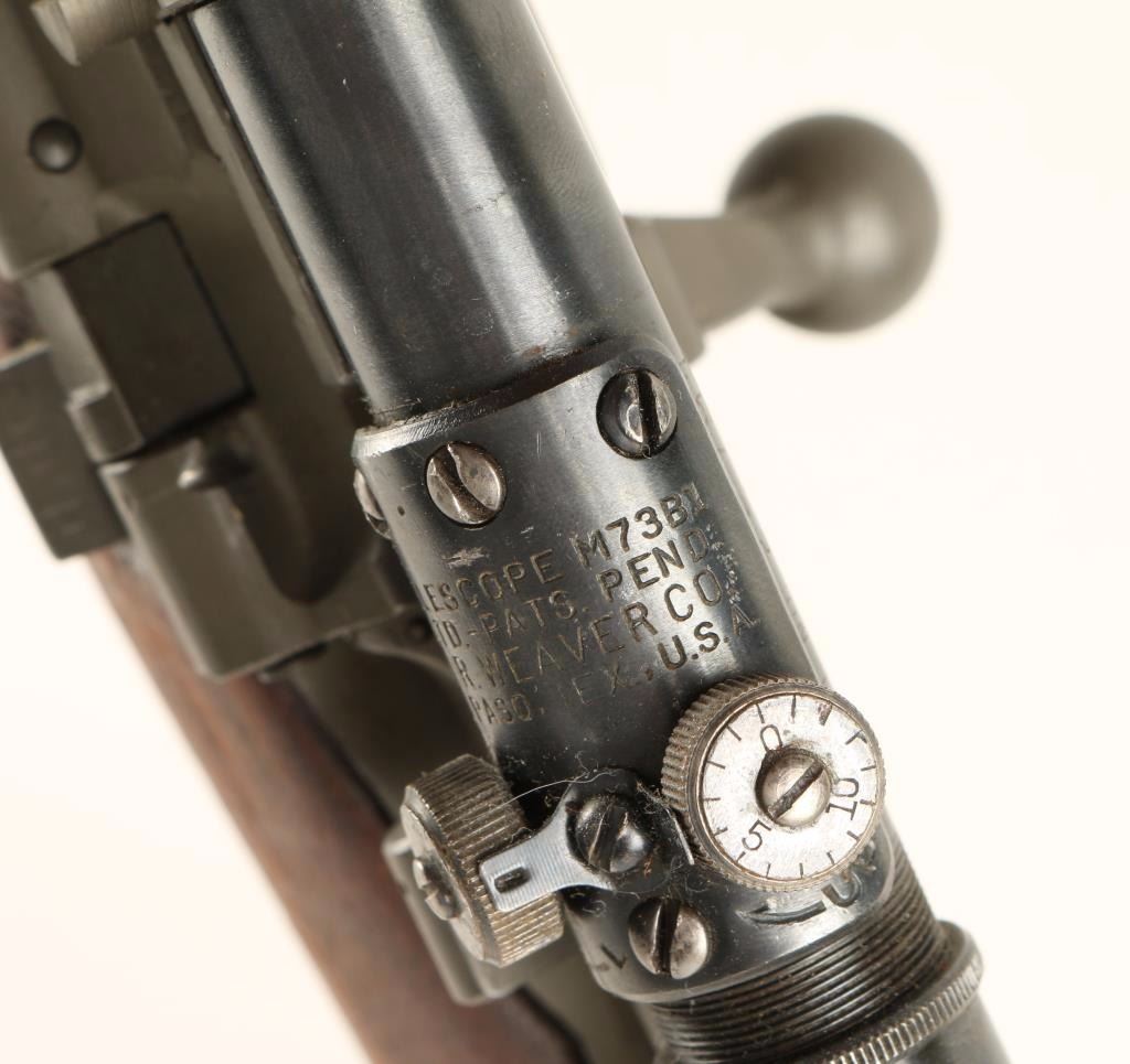 Rebuilt U.S. Military bolt action sniper rifle chambered in .30-06 Springfield, circa 1942. Features a parkerized finish, 24" barrel marked "RA(flaming bomb)9-43", removed front sight, Weaver M73B1 scope on Redfield base, integral five round box magazine with cut-off switch, bent bolt handle, safety switch on bolt, smooth trigger, two barrel bands with bayonet lug, three sling swivels, full length smooth walnut forend and semi-pistol grip shoulder stock with circled "P", "F.J.A", & "RIA / EB" cartouche. Scope is in excellent condition. Rifle retains approximately 98% of it's arsenal refinish with very little wear. Action is smooth, bore is pristine, and wood stocks are extra fine. Condition is excellent. ***C&R Firearm*** ***Modern Firearm***