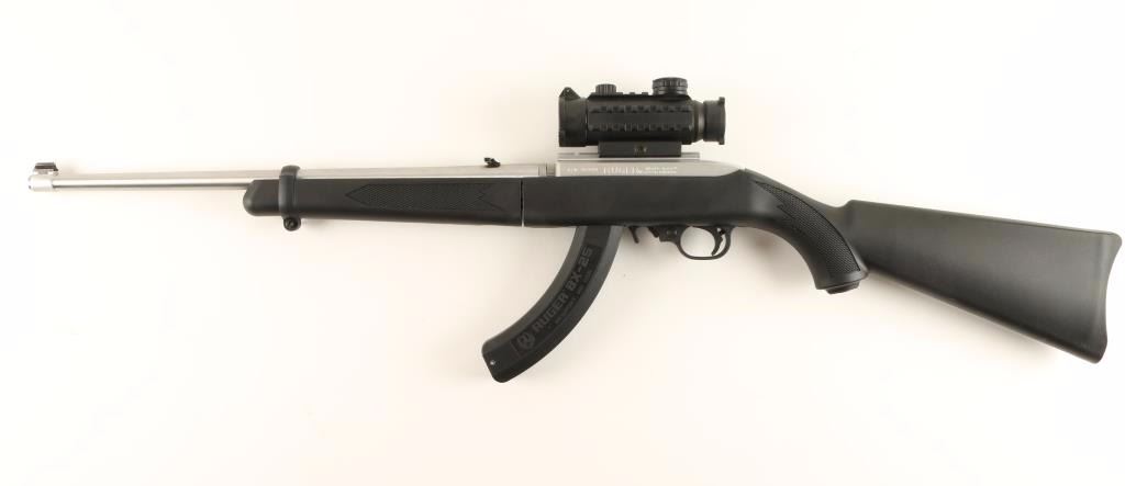 Stainless steel semi automatic take-down rifle chambered in .22 Long Rifle. Features a satin finish, 18.5" barrel, blade front sight with gold bead, flip-up adjustable rear sight, green/red dot scope, 25 round factory magazine, serrated trigger, push button safety, hold open lever, and checked black synthetic forend & pistol grip shoulder stock. Includes a factory embroidered padded soft case. Rifle shows little to no wear. Action is smooth, bore is pristine, and stocks are fine. Condition is excellent. ***Modern Firearm***