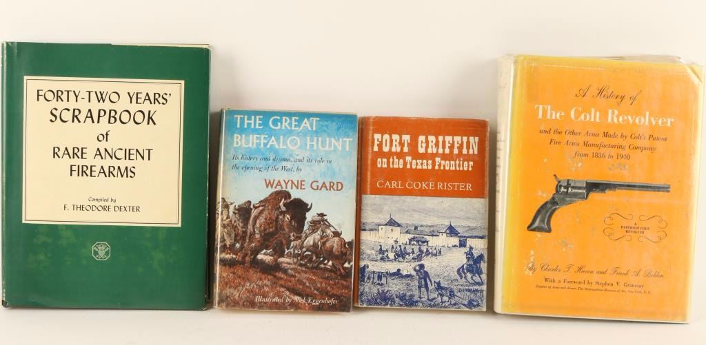 'The Great Buffalo Hunt' 1st Edition 1959 by Wayne Gard, 'Fort Griffin on the Texas Frontier' 1st Edition, 2nd print 1956 by Carl Coke Rister, 'Forty Two Years' Scrapbook of Rare & Ancient Firearms' 1954, 274/2000 Signed by author F. Theodore Dexter, and 'A History of The Colt Revolver and Other Arms Made by Colt's Patent Fire Arms Manufacturing Company from 1836 to 1940' by Charles T. Haven and Frank A. Bolden.