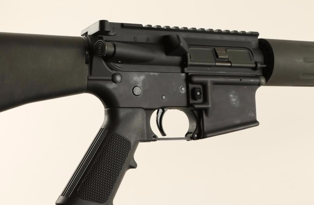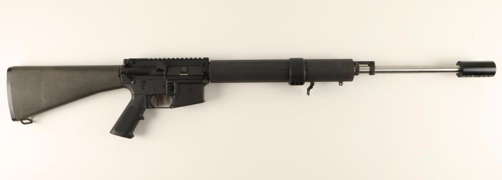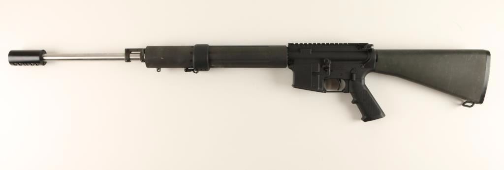'Competition HBAR' Gas-operated semi-automatic AR style rifle chambered in .223 Remington. Features a stainless steel 24" HBAR Elite barrel with large muzzle break, milled upper receiver with integral scope rail, shell deflector, sling swivels, forward assist, no magazine, fluted aluminum free floating forend, safety selector, A2 style pistol grip, and black synthetic shoulder stock with trap door buttplate. Rifle retains 94% finish with few minor losses and handling marks. Action is strong, bore is very good with some debirs, and stocks are fine. Condition is excellent. ***Modern Firearm***