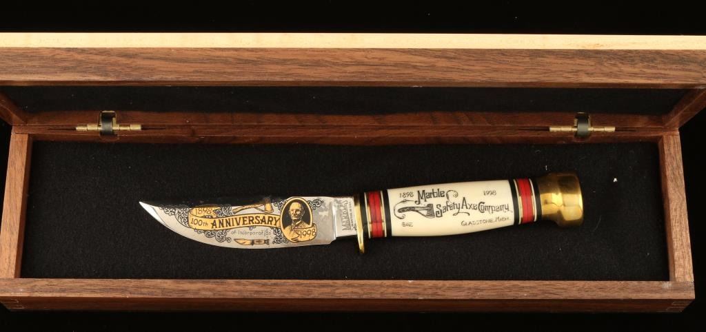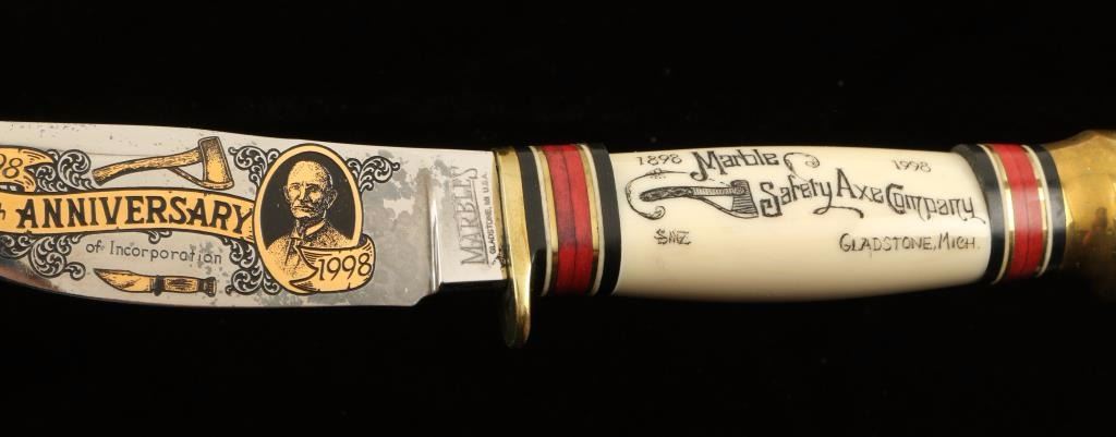 Etched blade that reads "1898-1998, 100th Anniversary of Corporation". Engraved bone handle reads "Marble Safety Axe Co. Gladstone, Michigan". Measures 8" overall with a 3 1/2" blade. Includes wooden box. Excellent condition.