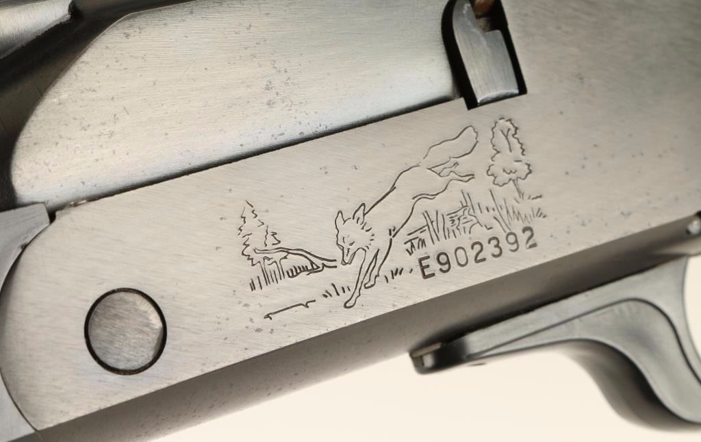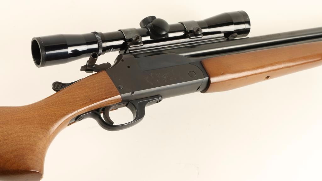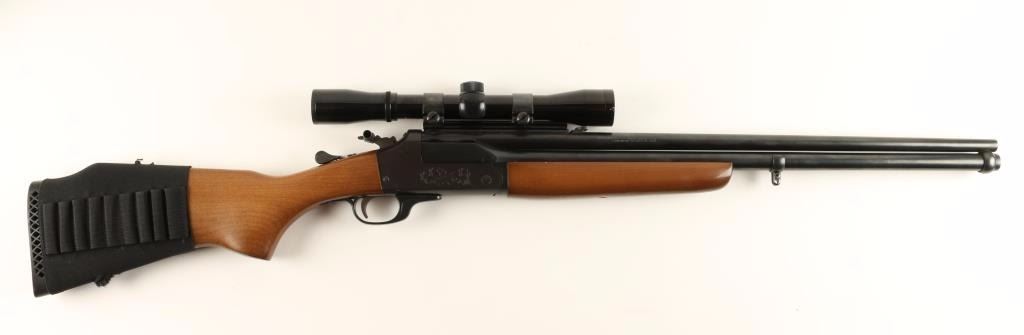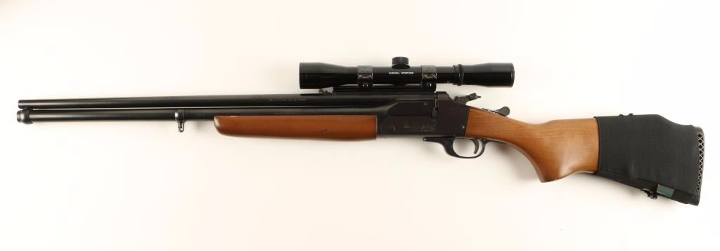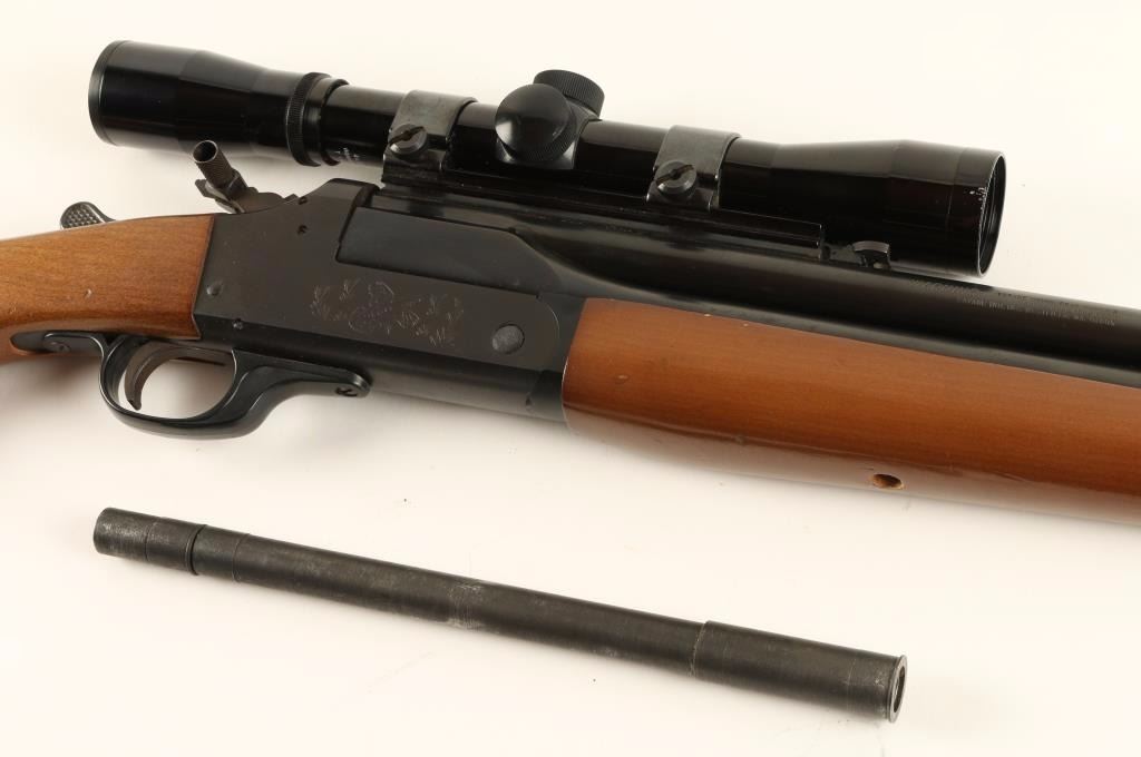 Double barrel over & under combination shotgun/rifle chambered in .30-30 Win and for 2 3/4" & 3" 20 gauge shells, circa 1960's. Features a blued finish, 24" barrels, removed front sight, folding adjustable rear sight, installed scope rail with fixed power Bushnell Sportsview 4x scope, swivel studs, checkered top lever, serrated hammer with barrel selector, checkered hammer extension, engraved receiver with fox & bird scenes, smooth trigger and hardwood forearm and pistol grip shoulder stock with rubber recoil pad & soft cartridge holder. Includes a 10" rifled .30-30 caliber barrel insert that fits in the 20 gauge barrel making it a double rifle, bore on this insert is very good. Finish shows only minor handling wear with few small spots of oxidation on right side of barrel and left side of the receiver. Action is smooth, bores are excellent and wood stocks are very good with minor losses to some edges. Condition is very good+. ***C&R Firearm*** ***Modern Firearm***