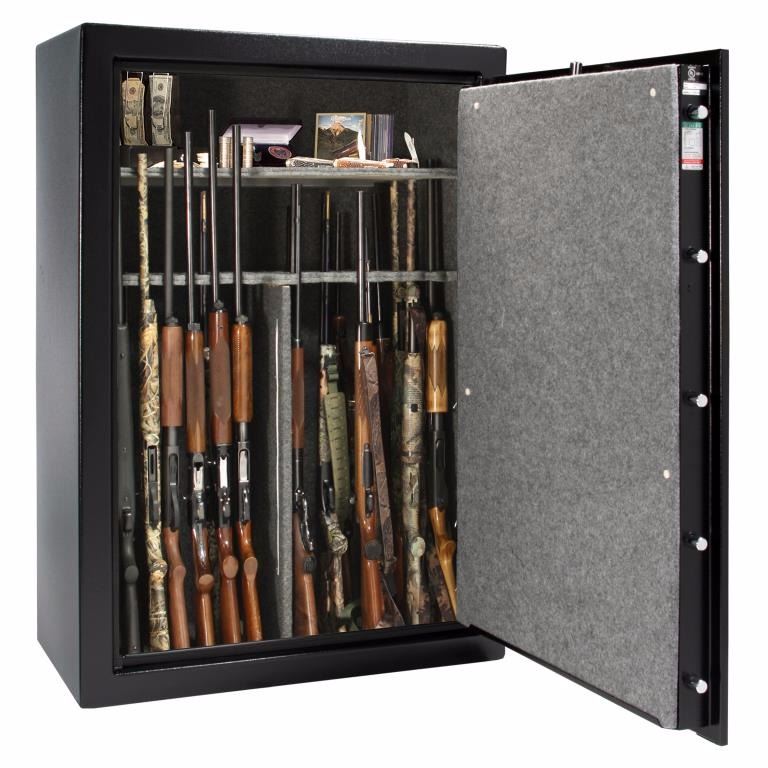 E.Magnum 50, Model MG-P5 2004, fire rated at 1200 degrees 2 hours, Black safe with gold trim, carpet lined and set up for storing firearms and collectibles, clear view lights inside, include combination, key, manual. Excellent condition, has to be moved by a professional. Weight 1575 pounds. Retail $6500.00 Measures 72.5"x 42"x 28". WE DO NOT SHIP OR DELIVER SAFES. YOU MUST MAKE ARRANGEMENTS IF YOU PURCHASE.
