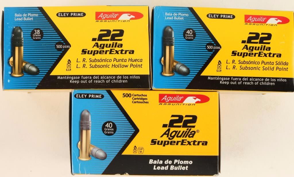Consisting of three 500 round cases of Aguila SuperExtra 40 grain Eley primed solid point ammunition.