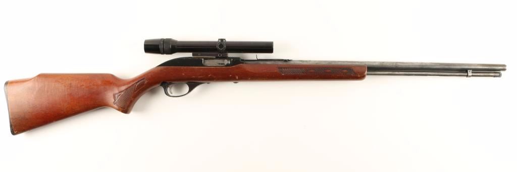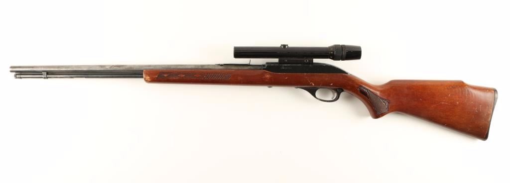 Blued, black alloy, black plastic, tube magazine fed semi-automatic rifle with a 22" barrel, Bushnell Scopechief II 22 3-8X scope, wood Monte Carlo stock with stamped panels and factory plastic butt plate. Made by Marlin Firearms. Bluing on barrel and mag tube has faded to silver with freckling from surface rust. Alloy receiver has edge wear. There is no front sight and the rear sight is missing the elevation ramp. The bore is mirror bright with good rifling. Trigger guard is early alloy type and has edge wear with a few small scrapes. The wood has many scratches, scrapes, dings and rubs. There appears to be a small crack that hasn't opened up running from the safety cutout back towards the butt on each side. Action works well. Condition is fair. *Modern Firearm*