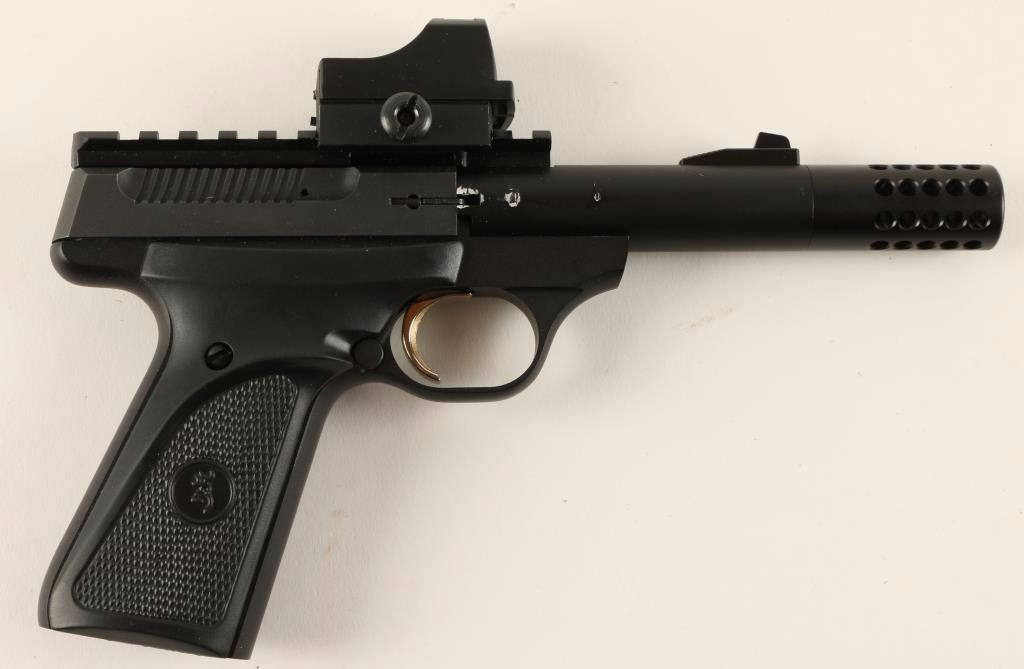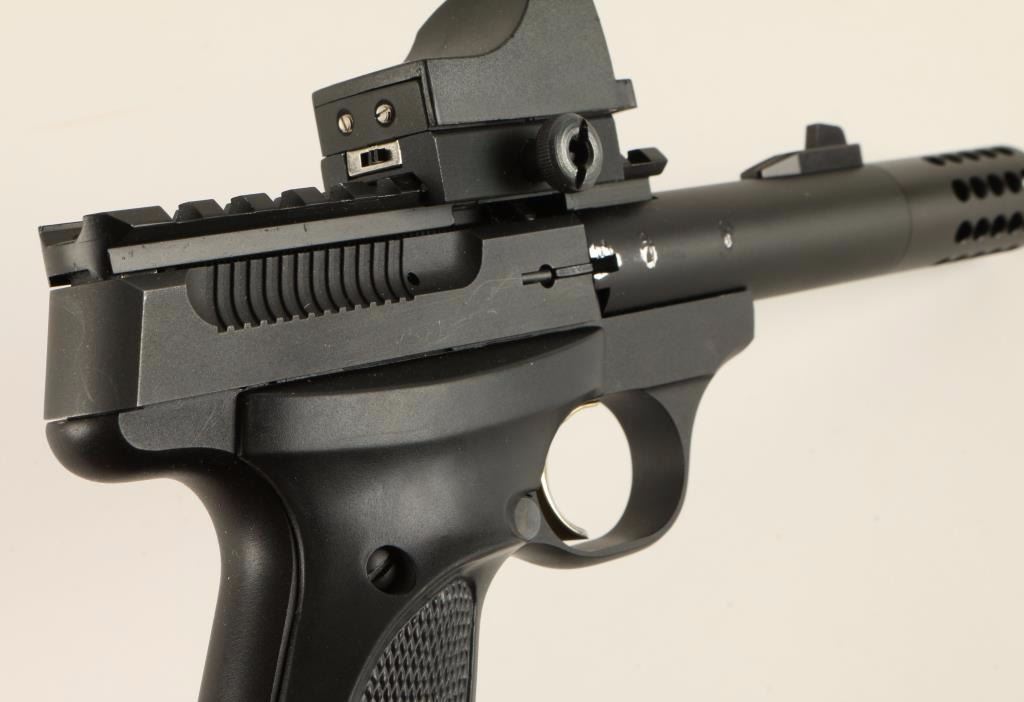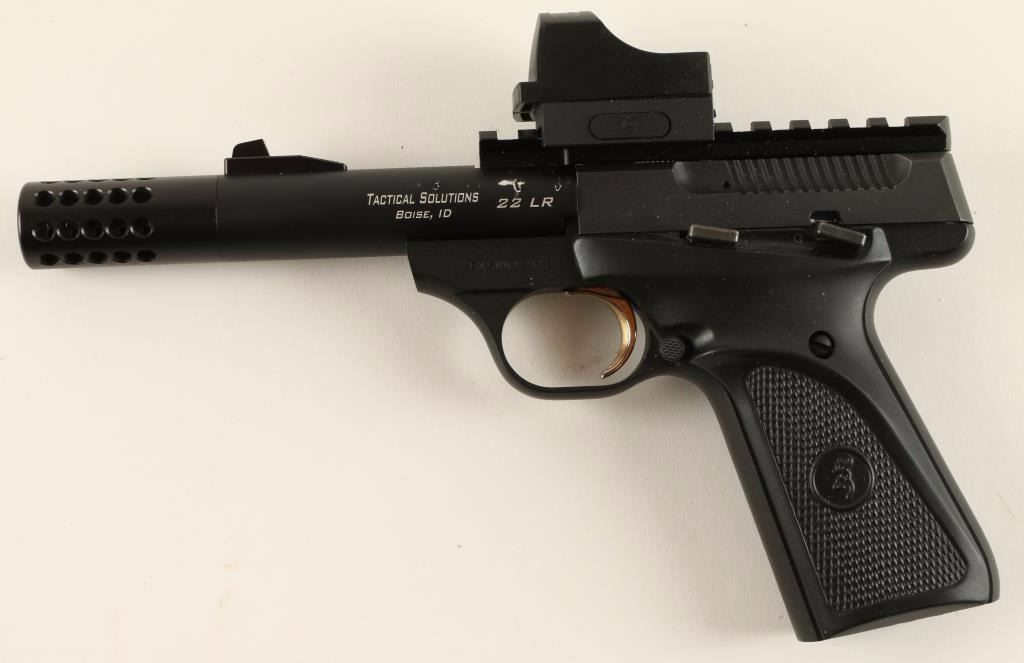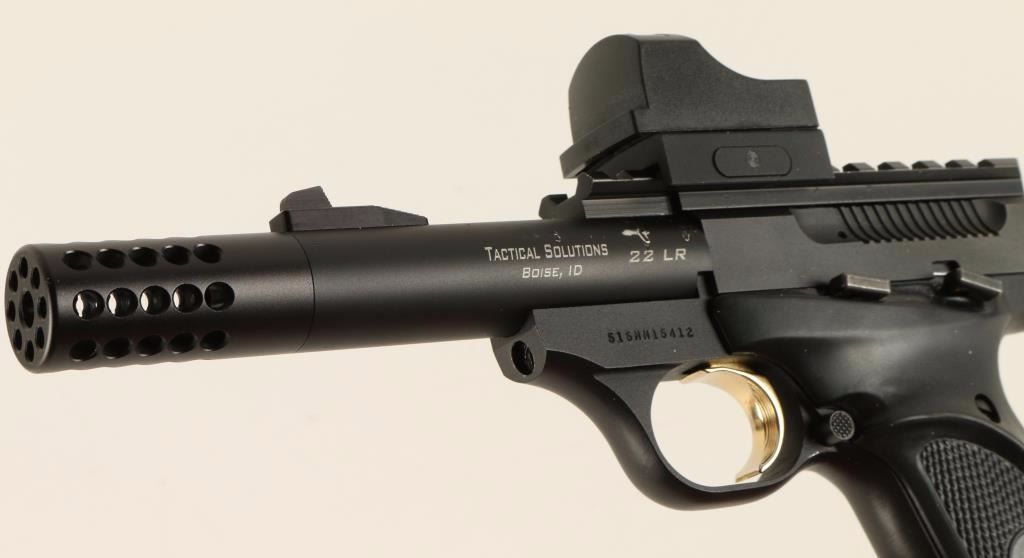 'Camper' Blowback-operated semi automatic target pistol chambered in .22 Long Rifle. Features a matte black finish, 4" Tactical Solutions Trail-Lite precision barrel with permanently affixed compensator, ramped front sail, scope rail, holographic sight, safety selector, partially serrated gold trigger, and Browning ambidextrous checkered black rubber grips. Pistol retains 90% original finish intact with losses from tooling on barrel. No magazine. Action is firm, bore shows light debris, and grips are fine. Condition is very good. ***Modern Firearm*** ***Modern Firearm***