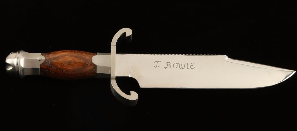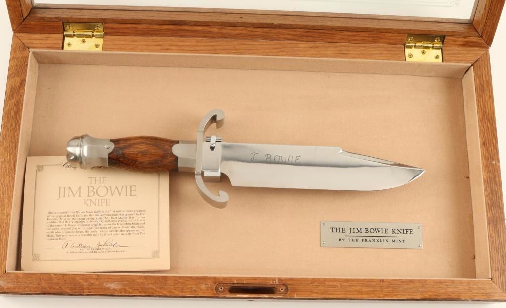 Wood handle, high polished blade which is laser inscribed 'J. Bowie'. Measures 14" overall with an 8" blade. Includes oak glass front display case and a certificate of authenticity from Franklin Mint.