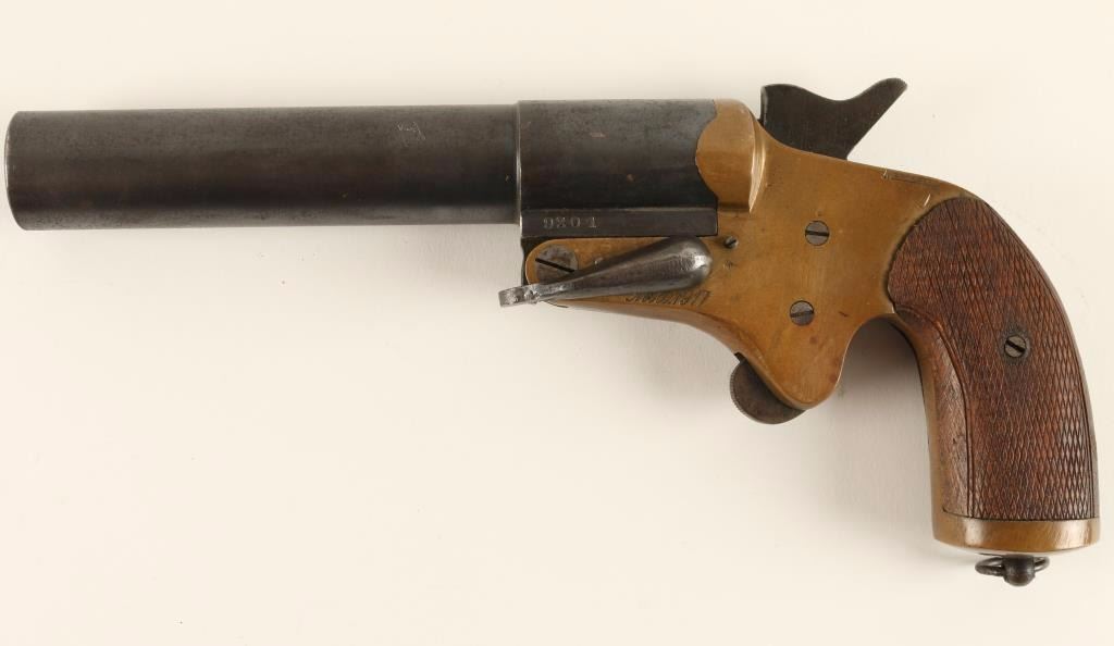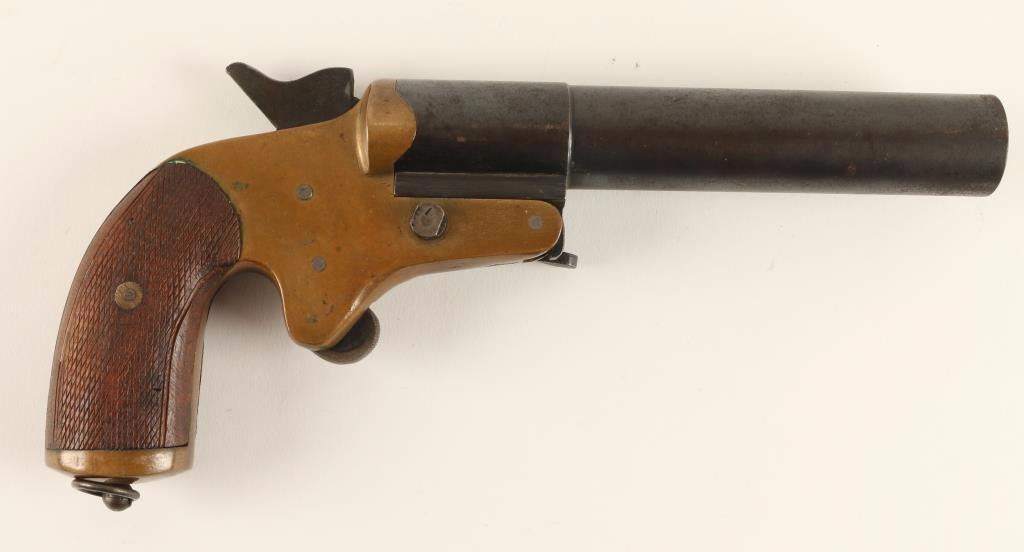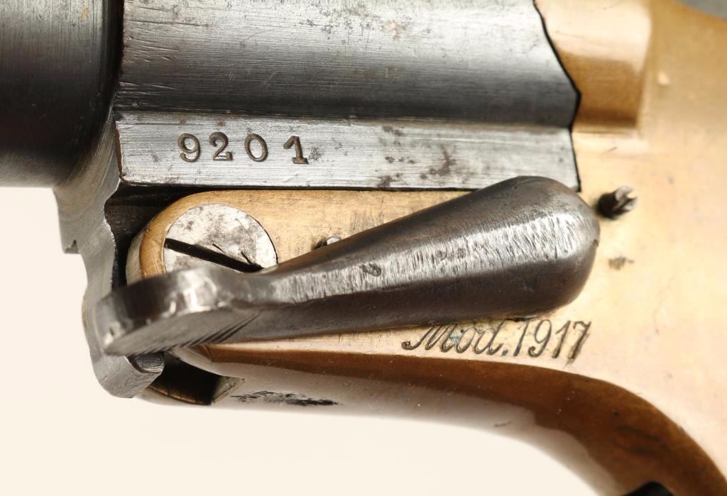 Serial number 9201 Brass frame with checkered wood grips. Good condition overall.