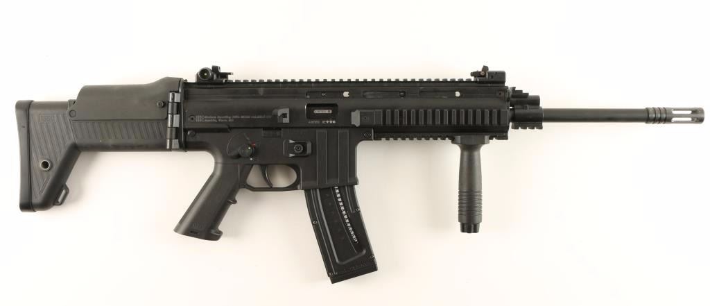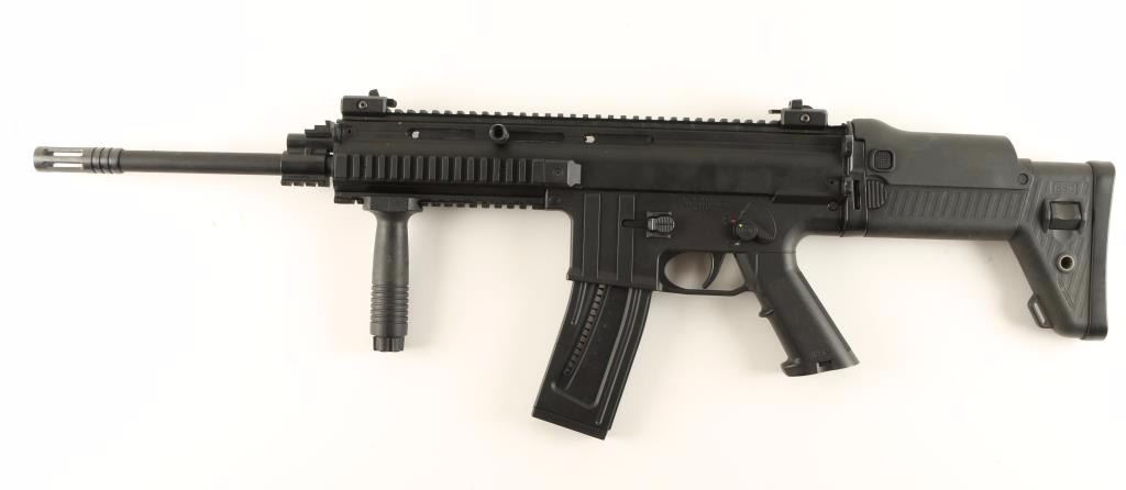 Black polymer, alloy and steel semi-automatic copy of an FN SCAR rifle with a folding butt stock, 16-3/8" barrel, forward pistol grip, adjustable folding front sight, five accessory rails, adjustable folding rear sight, 3-position butt stock length and one high capacity magazine. Exterior finish is excellent. Bore is mirror bright with strong rifling. Action works well. Condition is excellent. *Modern Firearm*