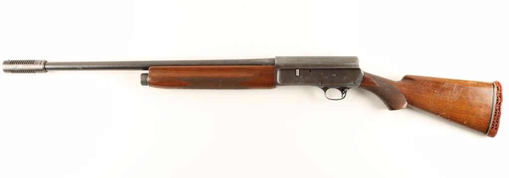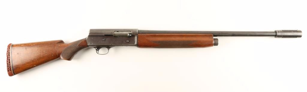 Blued semi-automatic, Browning patent semi-automatic shotgun with a Cutts compensator, 25-11/6" Full choke barrel (including compensator), single bead sight, wood furniture and collapsed/petrified recoil pad. Barrel has faded to dark gray or silver with rubs from recoil. Receiver has faded to plum or silver. Bore has axial lines which may clean to better. Wood has dings, rubs and scratches but no chips or cracks. Action works well. Condition is fair. *Modern Firearm*