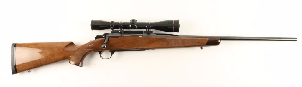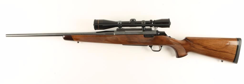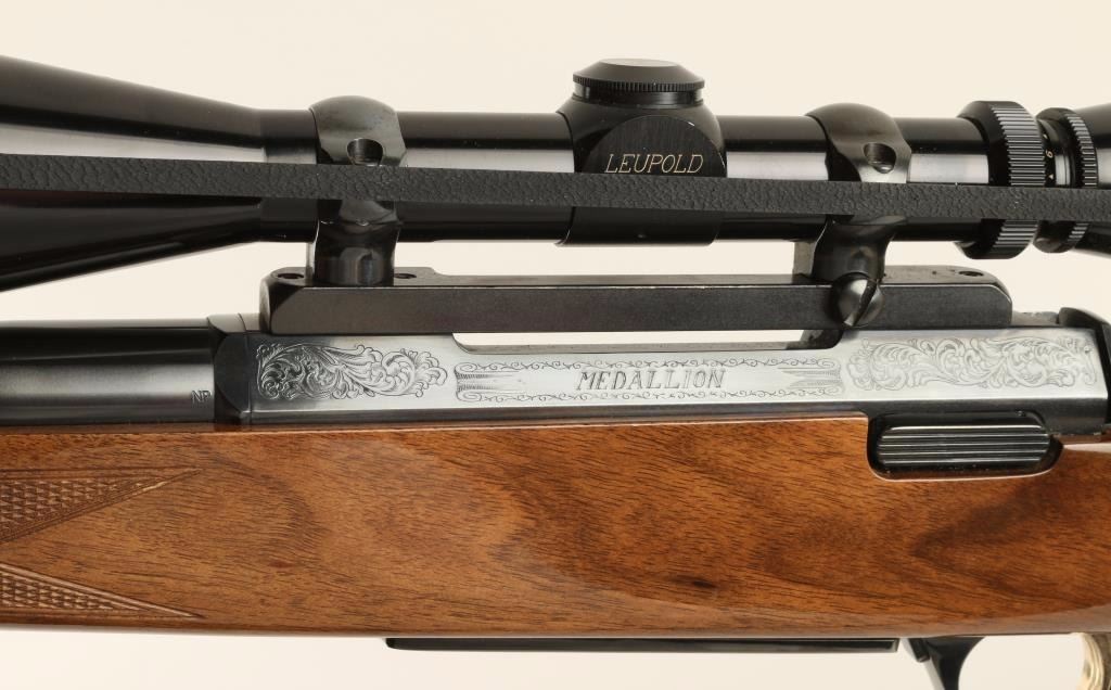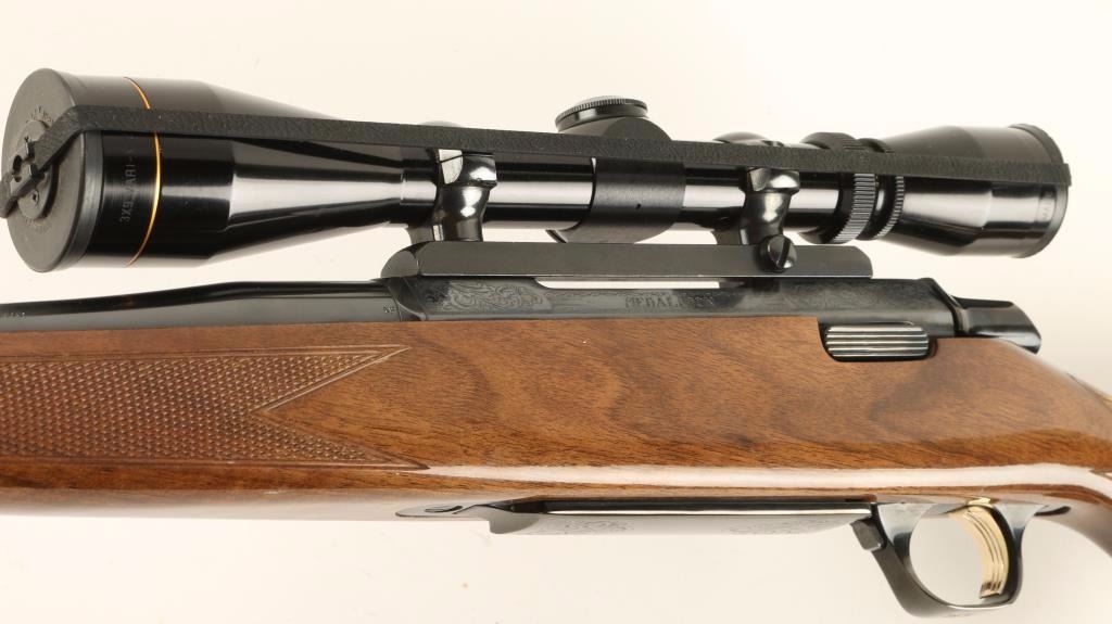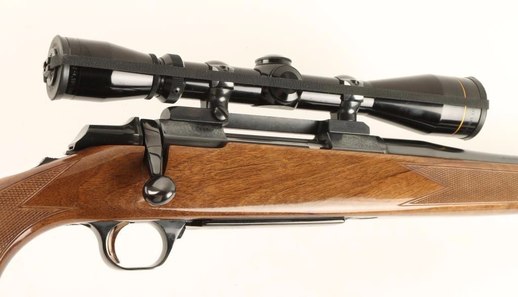 Blued bolt-action sporting rifle with a 22" barrel, recessed crown, sling studs, Leupold Vari-X IIc 3-9X scope, Redfield 1-piece scope base, hinged floorplate detachable magazine, 3 lug bolt head, tang safety, wood stock and a factory recoil pad. Bluing is in almost faultless condition with just a few tiny scratches and receiver has scrollwork stampings. Bore is shiny with sharp rifling. Action is very slick with 60 degree bolt throw and it functions well. The scope has a duplex reticle with a few scuffs on the exterior finish. The wood is almost impeccable with checkered panels and a few tiny rubs and scratches. Condition is excellent. *Modern Firearm*