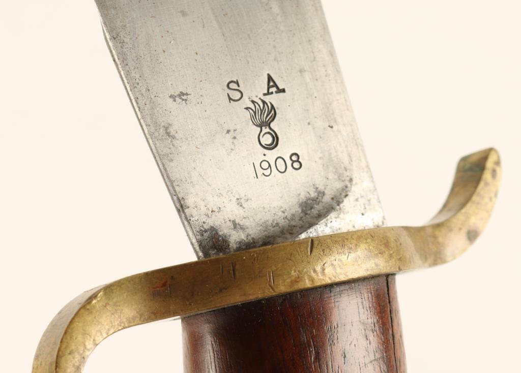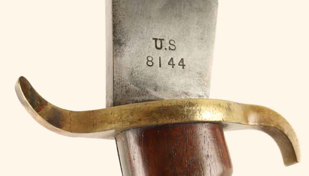 Original era manufacture. A sound example with a bright blade dated 1908 and US & SA proofed. The blade is clean, needs a light bath but no pitting or corrosion. Brass S guard with a nice patina, sound dark walnut grips with no cracks or chips. The leather scabbard has no issues, just scuffing and dryness to the leather surface. Mix of blue finish and light surface corrosion on the steel hanger. The leather scabbard is tamped Rock Island Arsenal 1910 H.E.K.