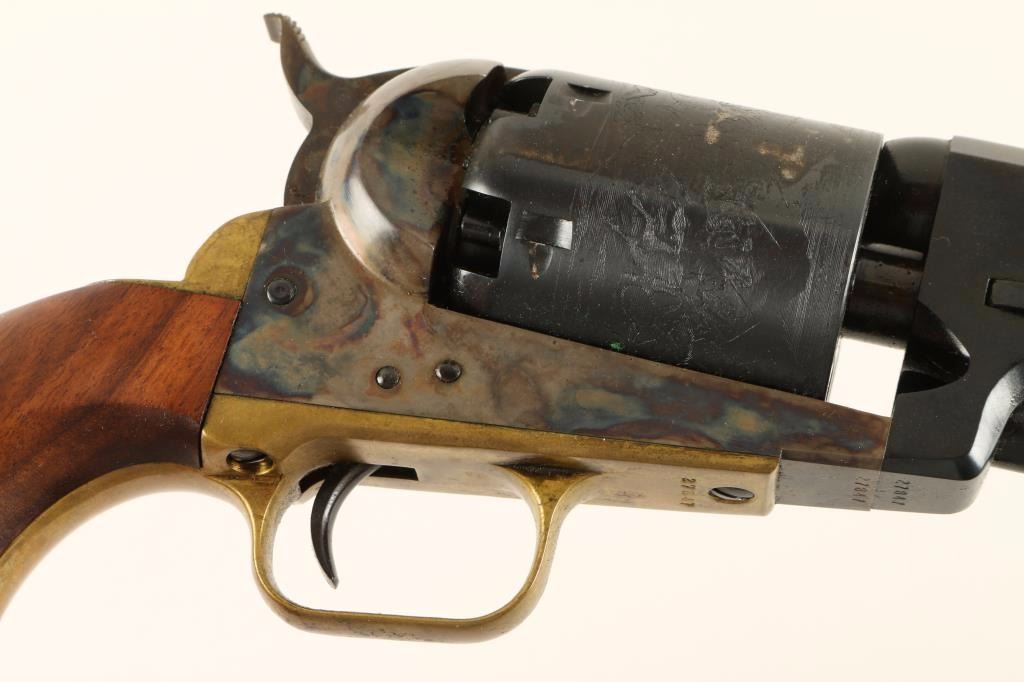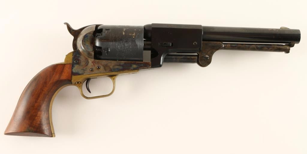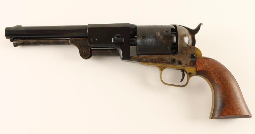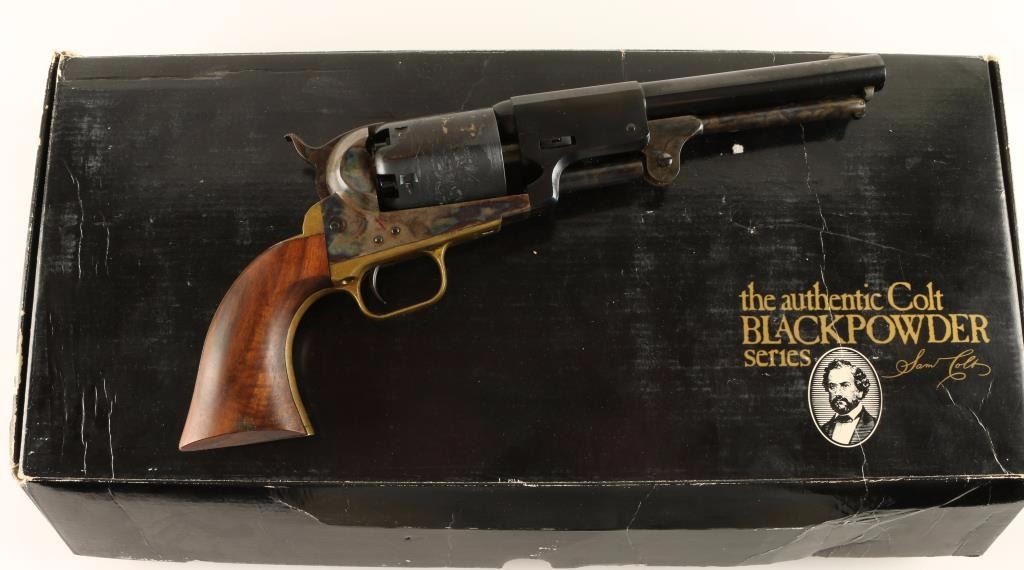 'The Authentic Colt Blackpowder Series' Modern reproduction of the 3rd Dragoon percussion revolver with .44 caliber bore. Features a 7 1/2" half octagonal blued barrel. Blade front sight, notched rear sight. Non- fluted 6 shot non-fluted with roll stamped cylinder scene with oval stops. All matching numbers, checkered hammer spur, smooth walnut grips, round brass trigger guard. Case hardened frame, loading lever and hammer. Includes original factory black cardboard box with documents. Revolver retains 80% of it's bright blued finish with losses and light oxidation and approx. 60% finish retained on cylinder with remainder being brown patina and bare metal. Action is mechanically sound, bore is clear, case colors are vivid and wood grips are very good. Condition is Good+ ***Antique Firearm***