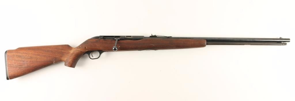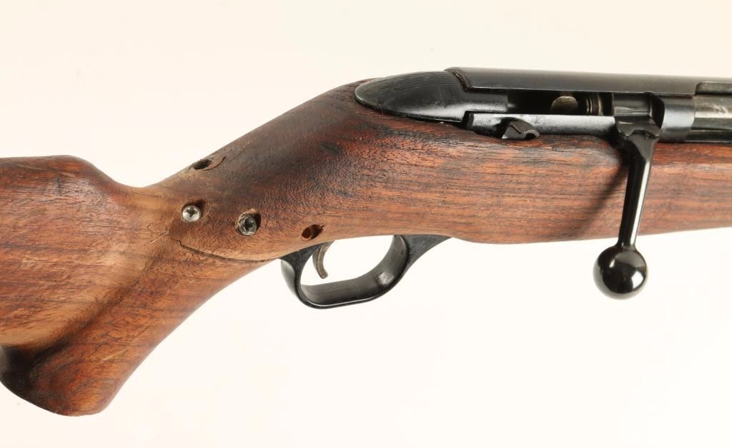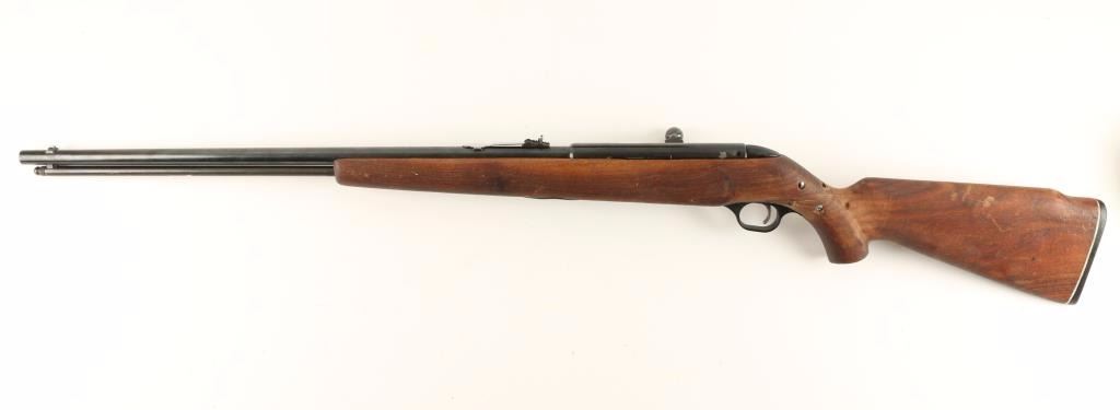 Blued, plastic, tube magazine fed, bolt-action rifle with a 24" barrel, adjustable rear sight, "Ac-Kro-Gruv" rifling and a wood stock broken through the wrist and repaired by Bubba with screws and glue. Bluing has some edge wear, scratches, pitting and surface rust. Bore is shiny with good rifling. The receiver plug is loose, The action works well. The stock is bare wood with scratches, scrapes and dings. The plastic trigger guard and buttplate have scratches and abrasions. Condition is poor with a broken stock. *Modern Firearm*