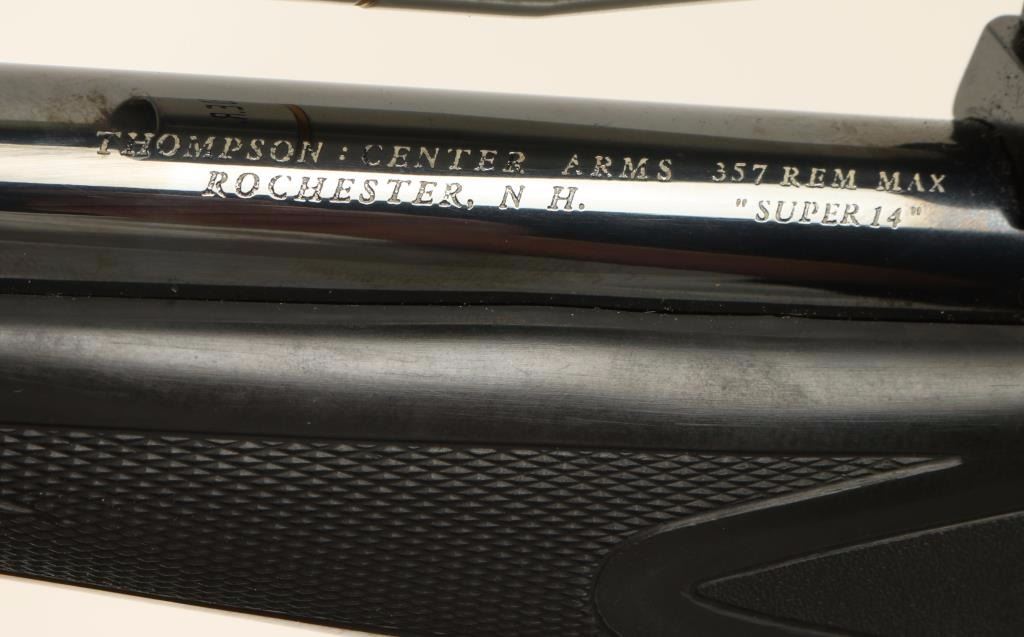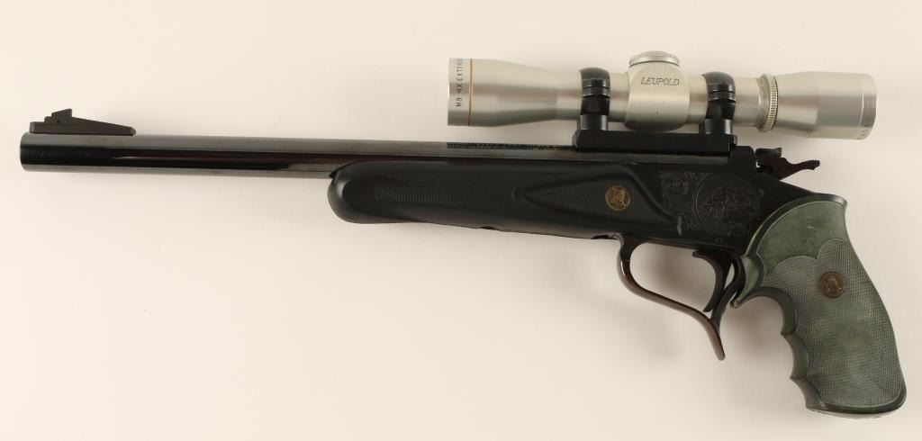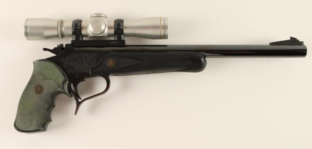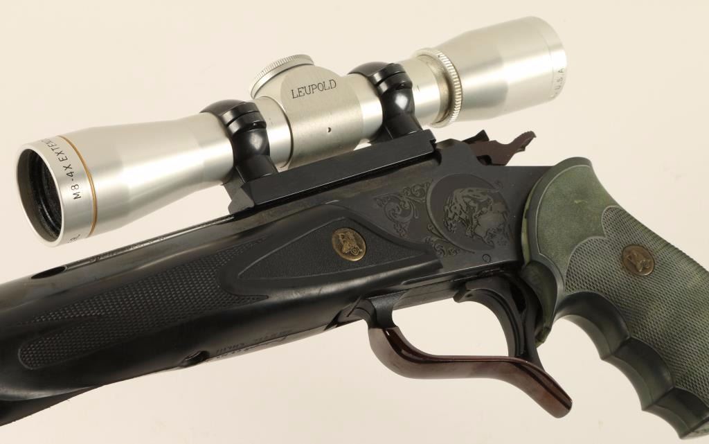 SN: 281445 'First Generation' Break-action single shot pistol chambered in .357 Remington Max. Features a blued finish, 14" heavy "Super 14" barrel with extractor, ramped blade front sight, Leupold M8 4x scope on Leupold base, engraved frame, serrated trigger, exposed hammer with safety selector, Pachmayr black checkered rubber schnabeled forend, and green pistol grip. Pistol retains 95% original finish with few losses. Action is firm, bore is very good, and stocks are fine. Condition is near excellent. ***Modern Firearm***