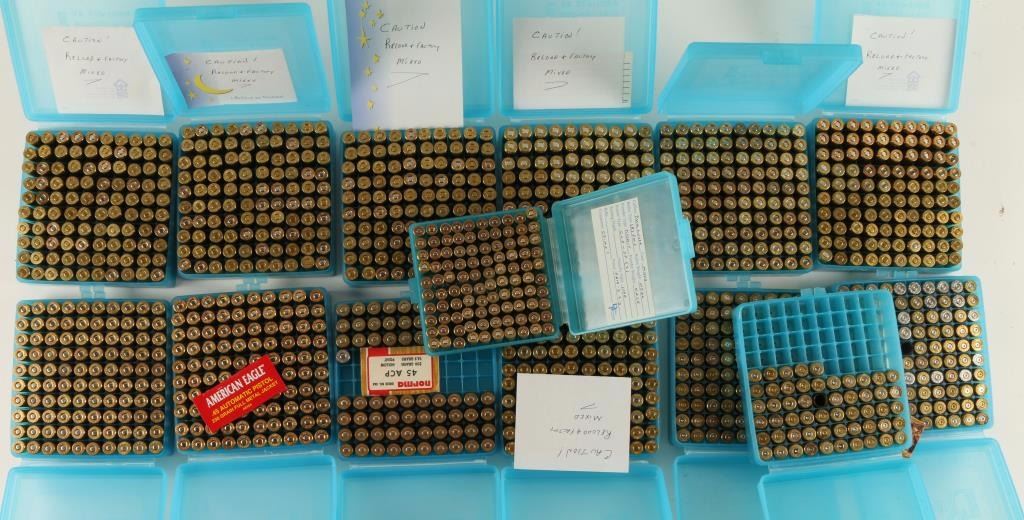Includes some reloads and factory. Approx. 900 Rds of 45 ACP. Also included 100 Rds reloaded 9mm and 45 Cal. Brass.