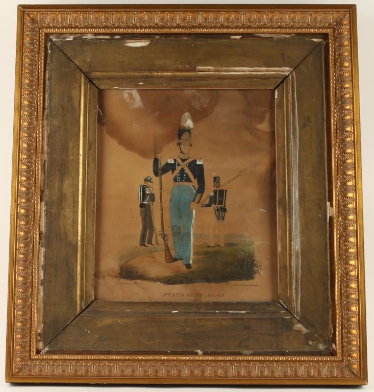 Published by J. MIddleton 21 N 6th Street, Philadelphia. Period piece of 3 soldiers from the Mexican War. Appears to have original frame and gold gilt frame around it. Image size 13"x10". Shows water damage to upper part of paper.