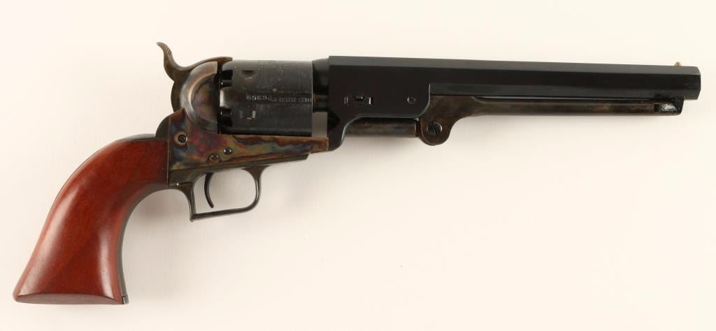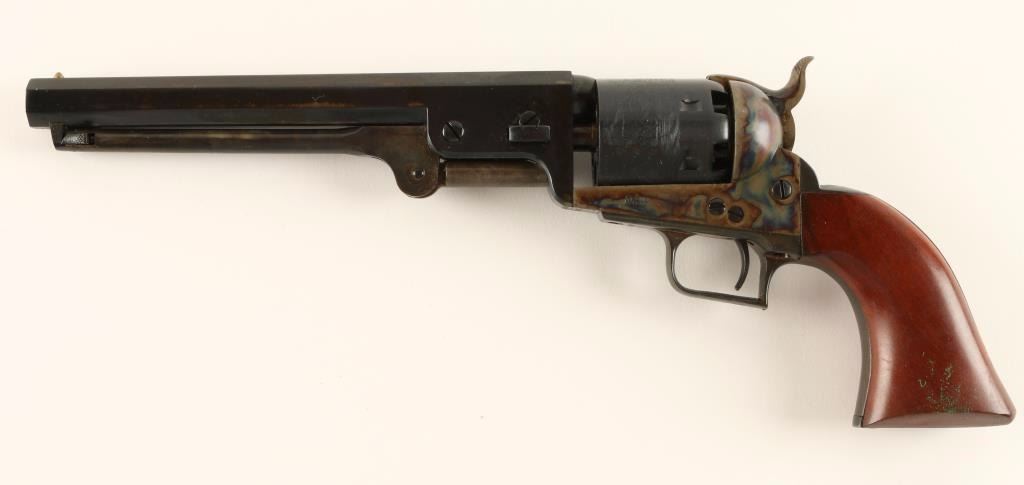 'The Authentic Colt Blackpowder Series' Modern reproduction of the 1851 Navy percussion revolver with ,36 caliber bore. Features a 7 1/2" blued octagonal barrel. Brass cone sight, notched rear sight. Non fluted 6 shot cylinder with naval engagement scene. All matching numbers, squared back trigger guard, checkered hammer spur, one piece smooth walnut grips. Case hardened frame, loading lever and hammer. Includes original black cardboard box with documents. Revolver retains 80% blued finish on barrel and approx. 92% finish retained on cylinder, both have storage wear. Action is mechanically sound, bore is clear, case colors are vivid and wood grips are fine. Condition is Good + ***Antique Firearm***