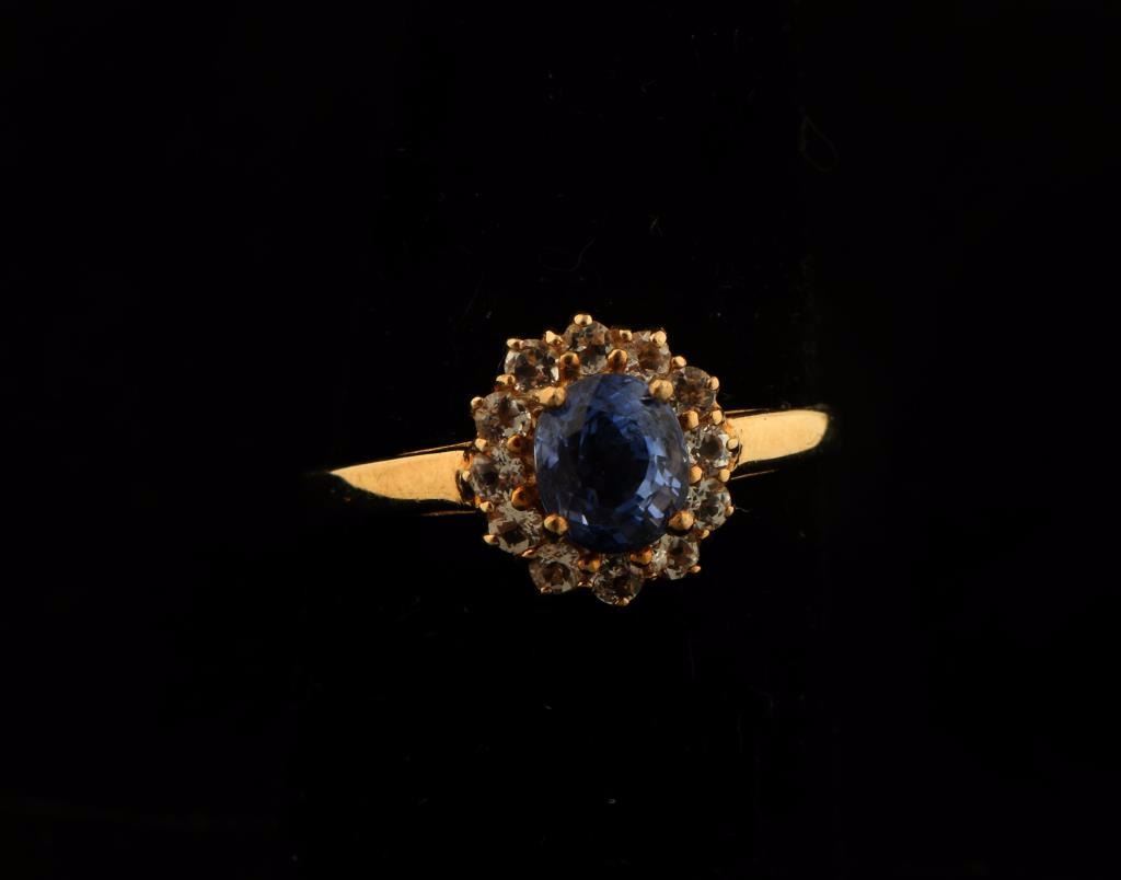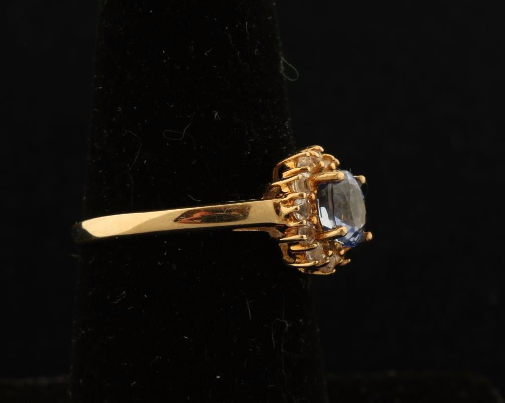 The sapphire is a lovely purplish blue tanzanite color, but stone tests as sapphire. It is surrounded by sparkling white topaz stones. All set in a durable 10K yellow gold setting. Size 6 1/2