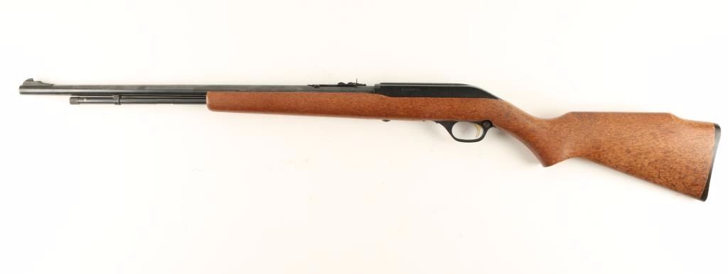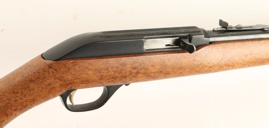Blued, black alloy, plastic semi-automatic tube magazine fed rifle with a 22" barrel, elevation adjustable rear sight, wood stock and factory butt plate. Bluing has minor edge wear with light surface rust freckling. Alloy receiver and trigger guard have tiny amount of edge wear and a few scuffs. Bore is shiny with good rifling. Action seems to work well. Wood has rubs. Butt plate has a tiny chip out of the toe. Has later style wide trigger group. Condition is very good. *Modern Firearm*