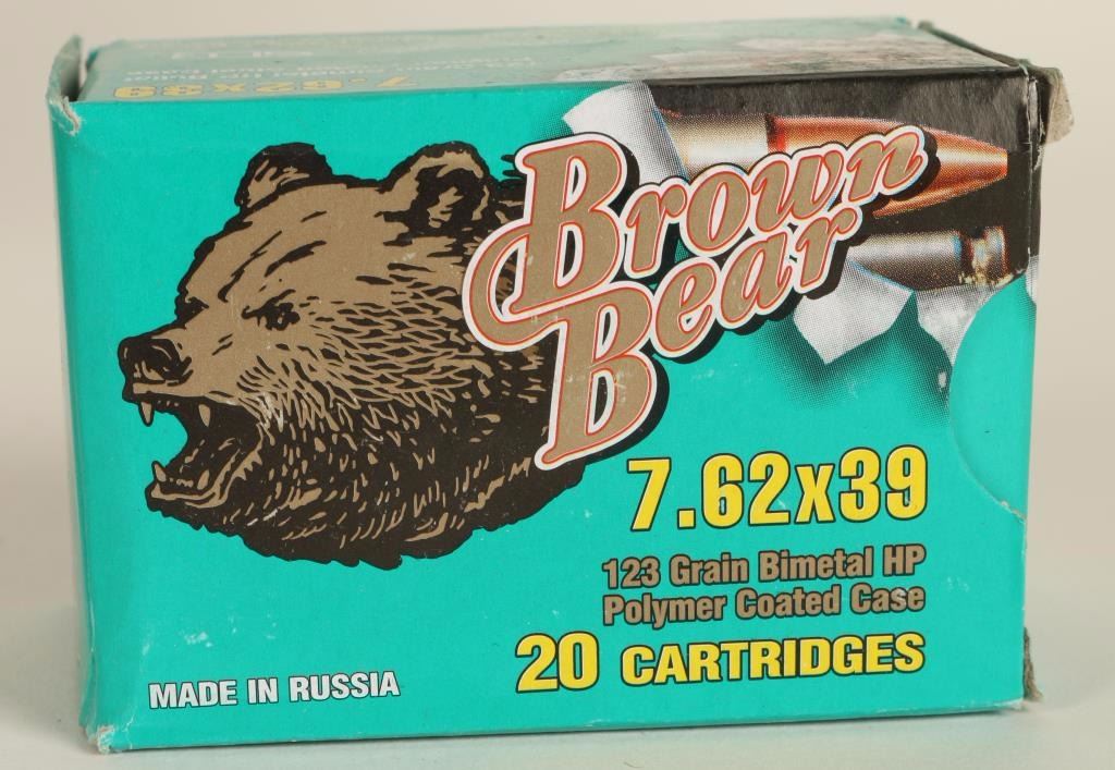 Consisting of twenty-five 20 round boxes of Brown Bear polymer coated case 123 grain bimetal hollow point ammunition.