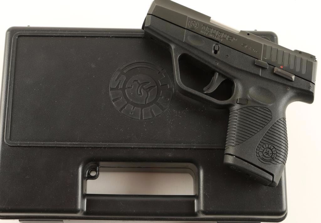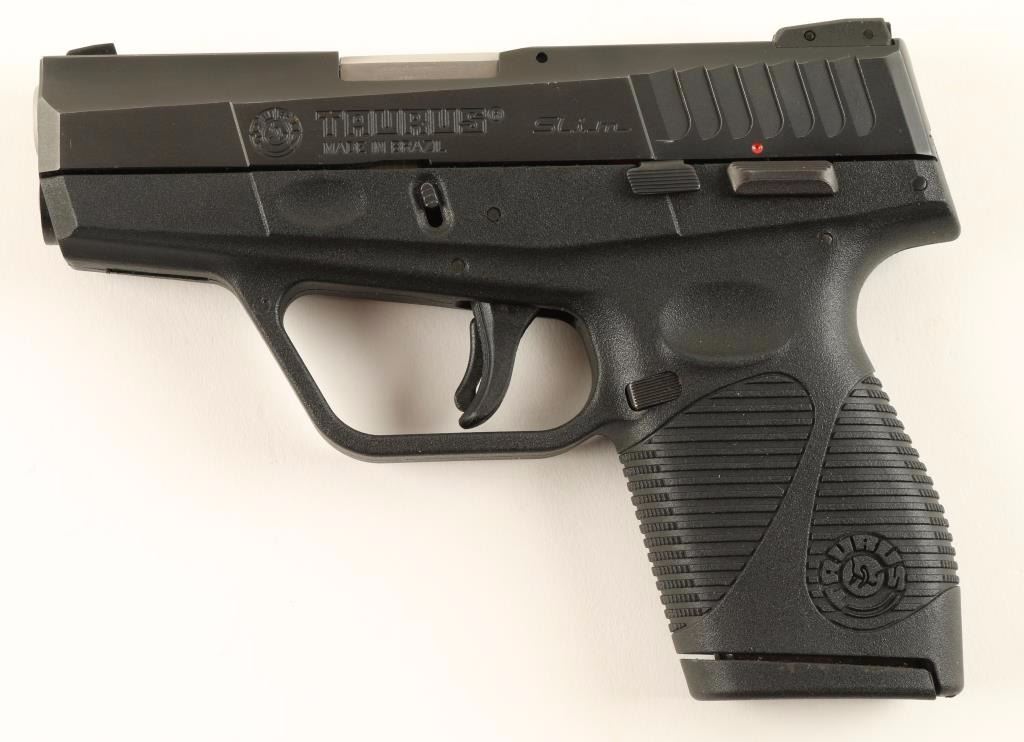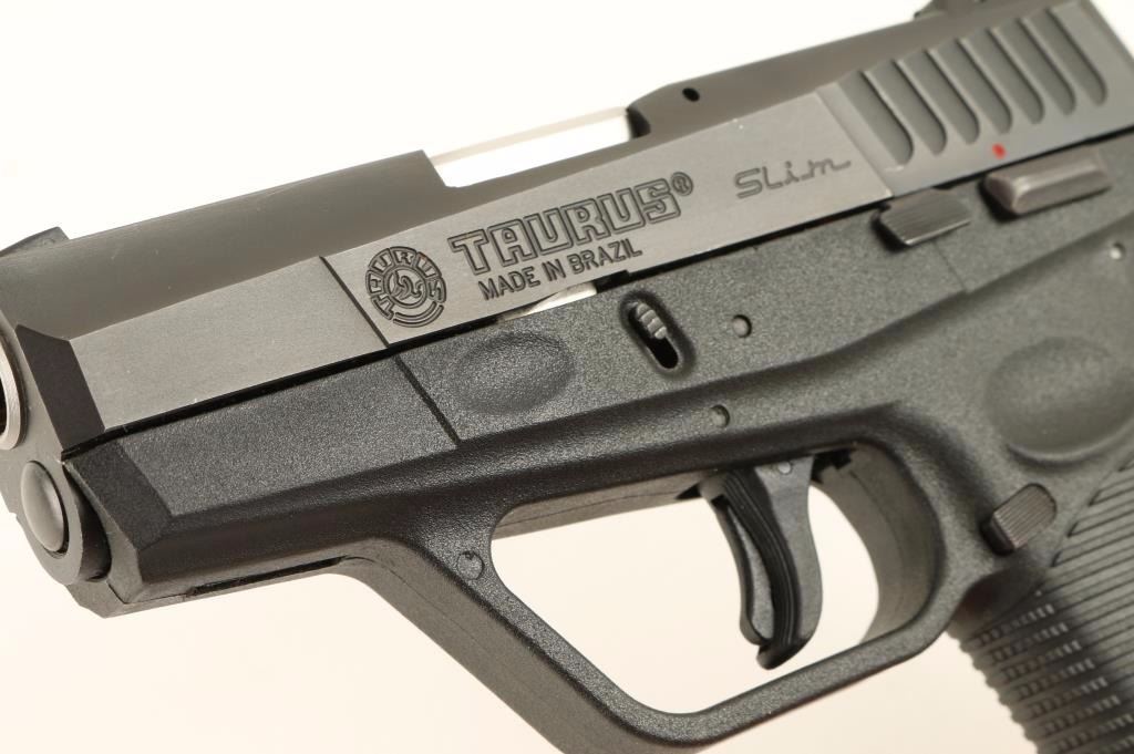 'Slim' Brazilian made compact double action only semi-automatic pistol chambered in .40 Smith & Wesson. Features a blued finish, 3.2" barrel, contoured steel slide with integral safety lock, adjustable three-dot sights, thumb safety, trigger safety, push button magazine release, 6 round magazine, and black polymer frame with integral serrated grips & ambidextrous thumb grooves. Includes a factory hard case with documents and tools. Finish shows few minor blemishes but is otherwise seemingly untouched. Action is crisp and bore is very good. Condition is near excellent. ***Modern Firearm***