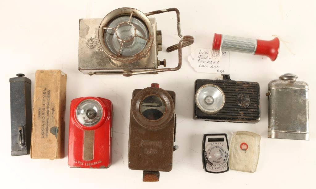 Including a WWII German railroad lantern made by Ceag, Nazi map light made by Hawe, WWI Army Corp. sighting level made by Swift & Anderson-glass is cracked, WWII Whermacht Officer's map light made by Pertrix, German traffic flashlight, WWII period French made map light, nickel plated flashlight and a WWII metered device.