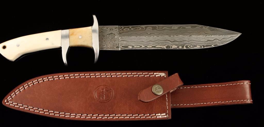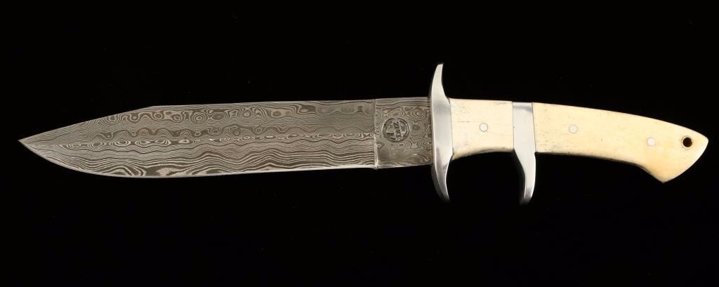 Damascus Steel with a Bull Bone Handle. The blade is approx. 8 1/4" and the handle is approx 5.5" with a silver/aluminum double guard. The blade is custom forged, hand pounded/folded steel with 250 layers of 1095 and 15N20 steel. A high quality leather sheath is provided. Everything is USA handmade within the family. Approx. 10 hours of work went into this knife and sheath. Kevin Johnson, DNZ Trading Company Mint.