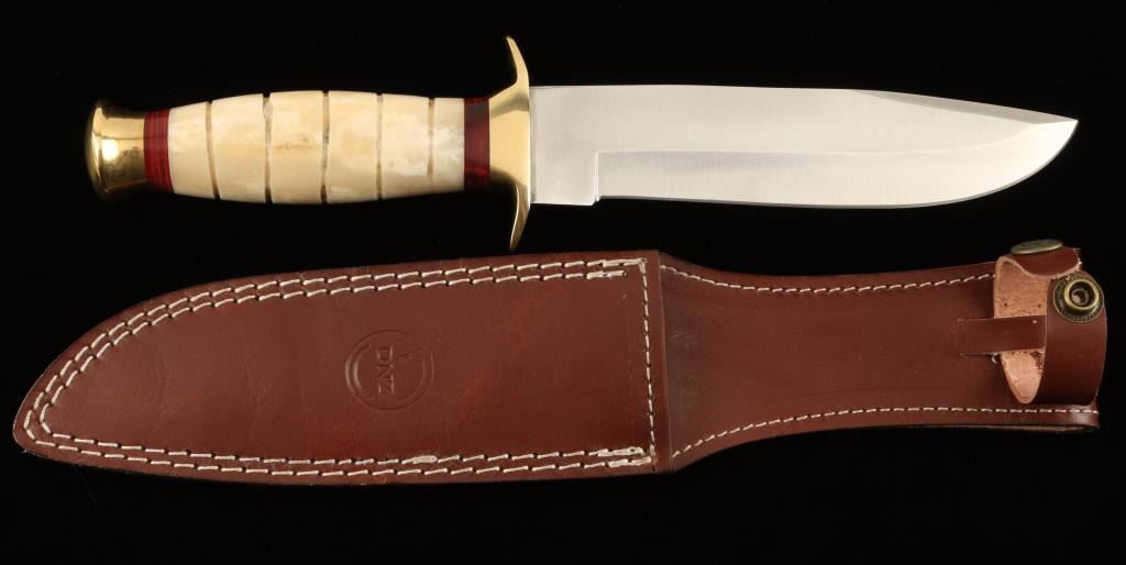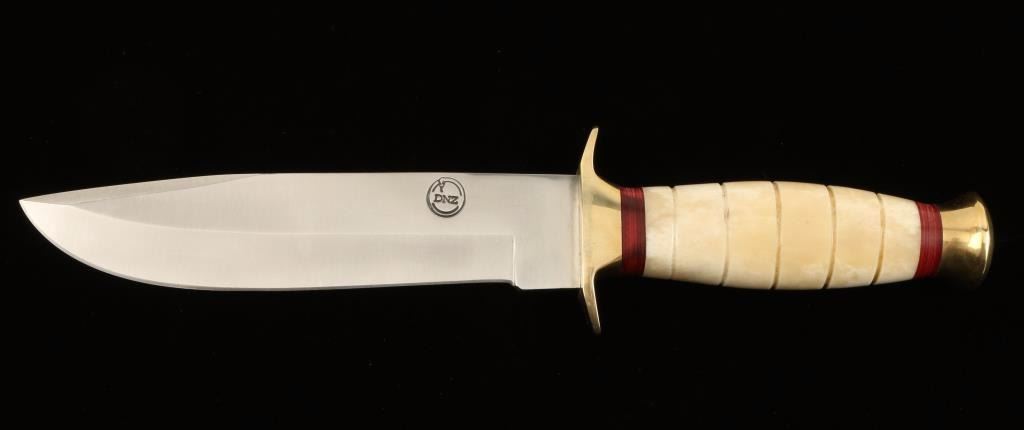 Special Edition Series with a Bull Bone and Brass Handle with Red Spacers. The blade is approx. 7" and the handle is approx. 5". The blade is custom forged high quality D2 Tool Steel heat treated and hardened to 59-60 on the Rockwell Scale with a razor edge. A high quality leather sheath is provided. Everything is USA handmade within the family. Approx. 9 hours of work went into this knife and sheath. Kevin Johnson, DNZ Trading Company Mint.