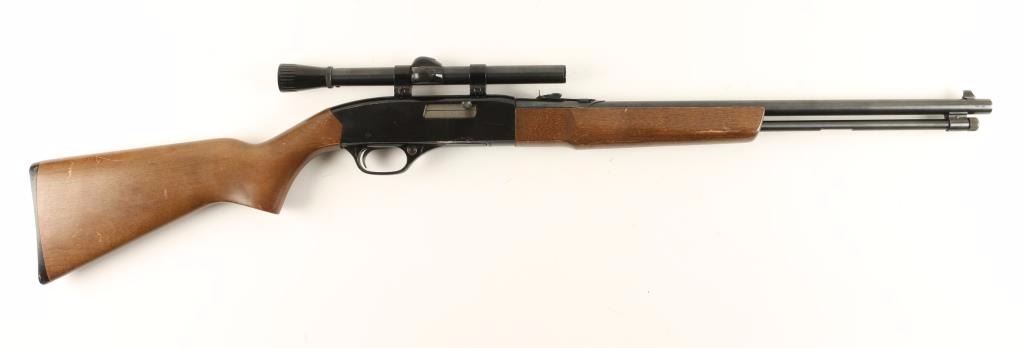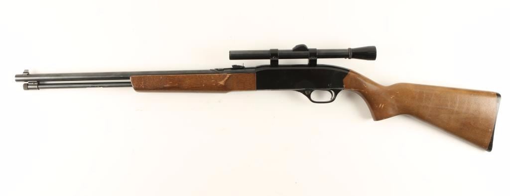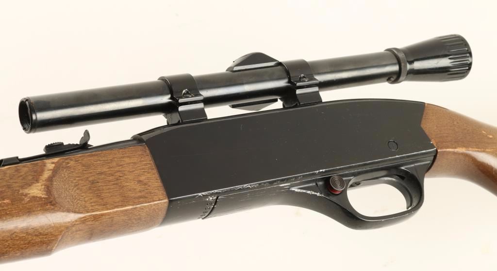 Blued, black alloy, plastic semi-automatic tube magazine fed rifle with a 20-1/2" barrel, elevation adjustable rear sight, Weaver marksman 4X scope, wood stock and factory butt plate. Bluing has edge wear, a few rubs and scrapes and a light freckling from surface rust. Alloy receiver/trigger guard have edge wear, abrasions, scuffs and dings. Bore is shiny with good rifling. Action works well. Wood has sharp edges with rubs, scrapes and dings. Butt plate has dents and scrapes. Condition is good to very good. *Modern Firearm*