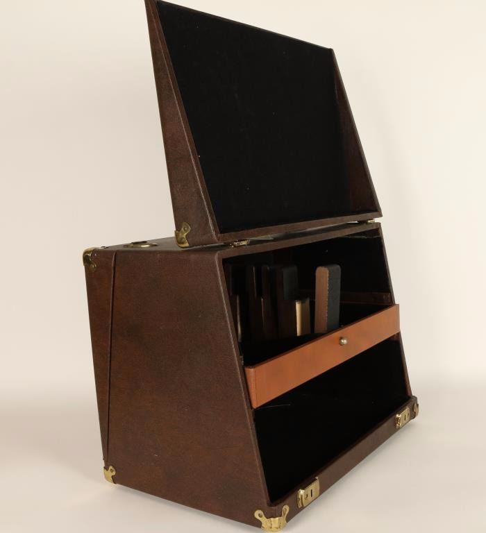 Felt lined holds 8 handguns, covered in faux brown leather.
