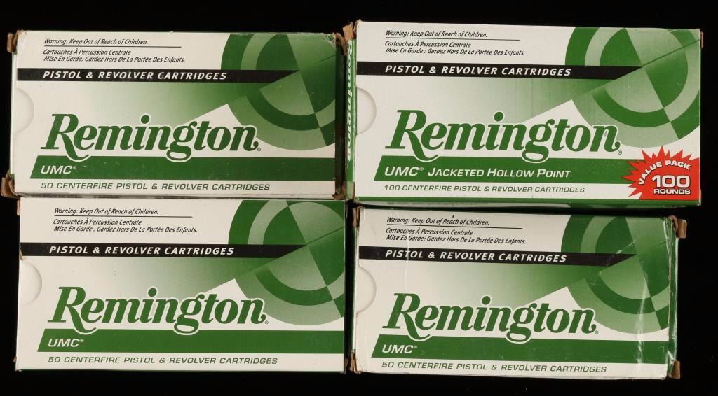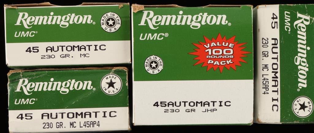 Consisting of three 50 round boxes of Remington UMC 230 grain metal case and one 100 round box of Remington UMC 230 grain jacketed hollow point ammunition.