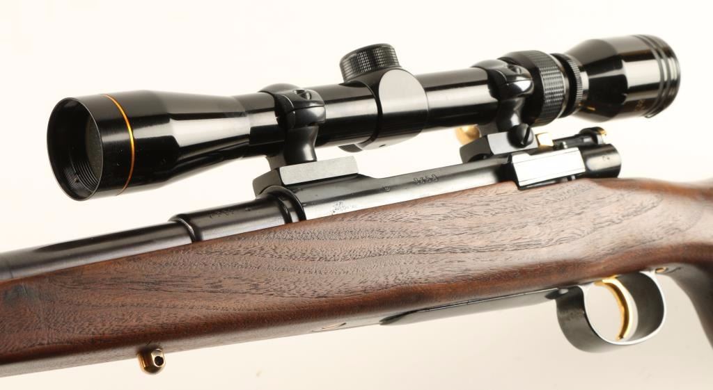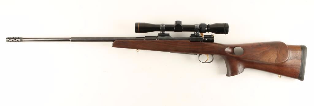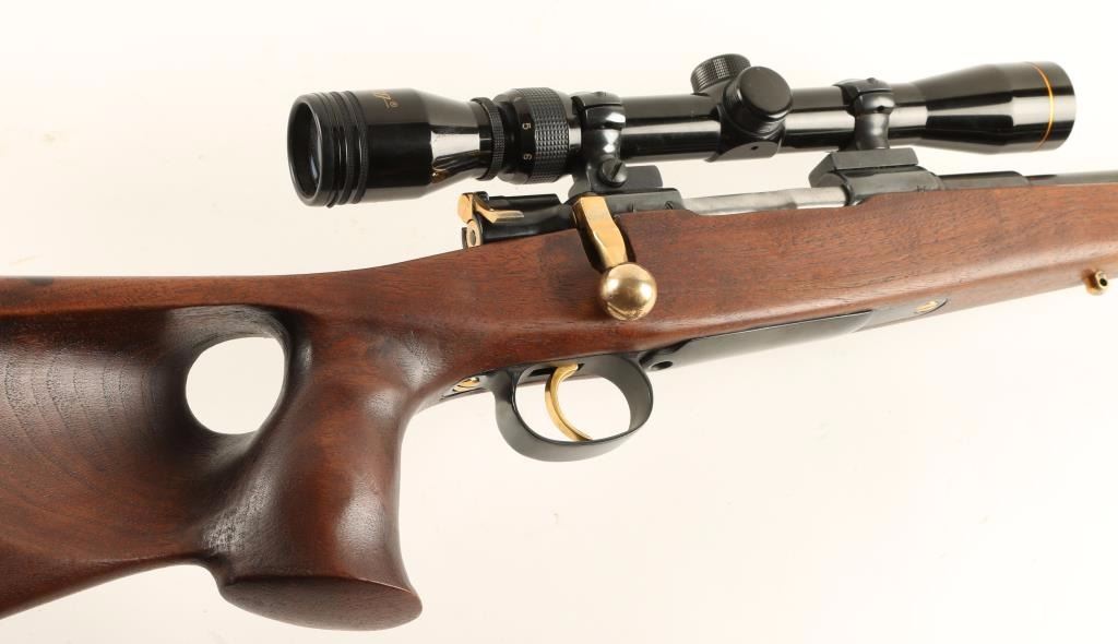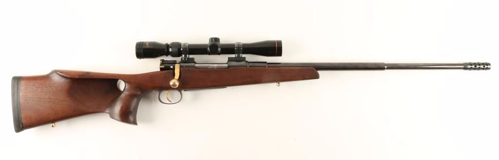 Custom bolt-action sporting rifle with a 23" barrel (including muzzle brake), Norinco 3-9X scope, custom thumbhole right hand 14" LOP stock, sling studs, gold plated highlights, rollover cheek rest and Kickeez recoil pad. Bluing is good over some pitted and buffed areas in the steel. Gold tone plating over bolt handle, trigger, safety, sling studs and action screws. Bore is frosty with rifling. Action works well. Thumbhole stock has palm swell and a few rubs. Scope has a duplex reticle. Condition is fair to good. *Modern Firearm*