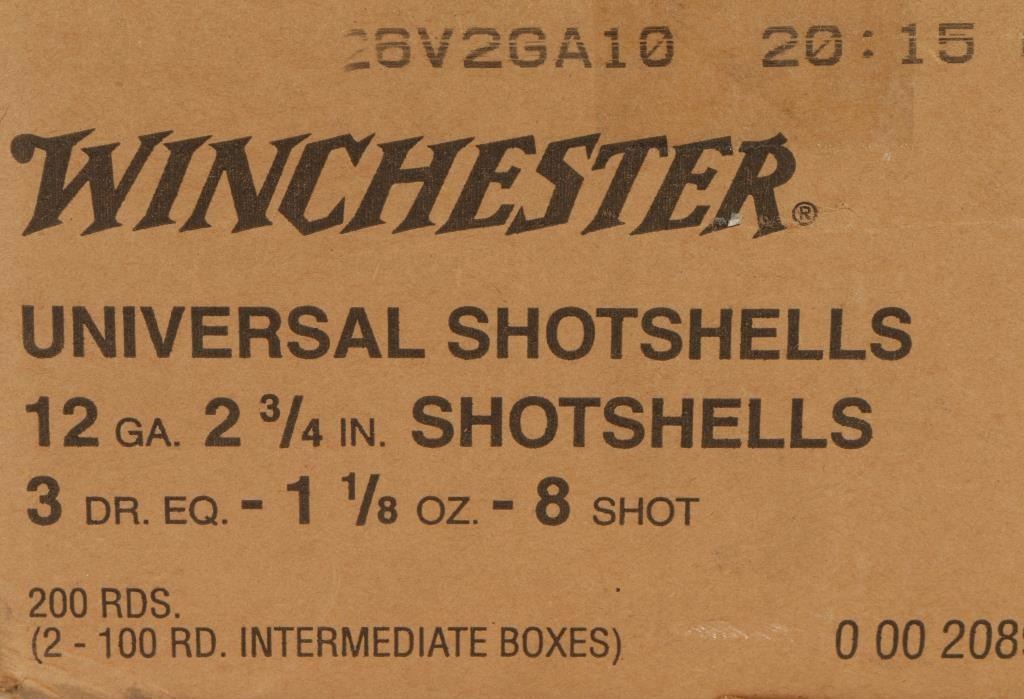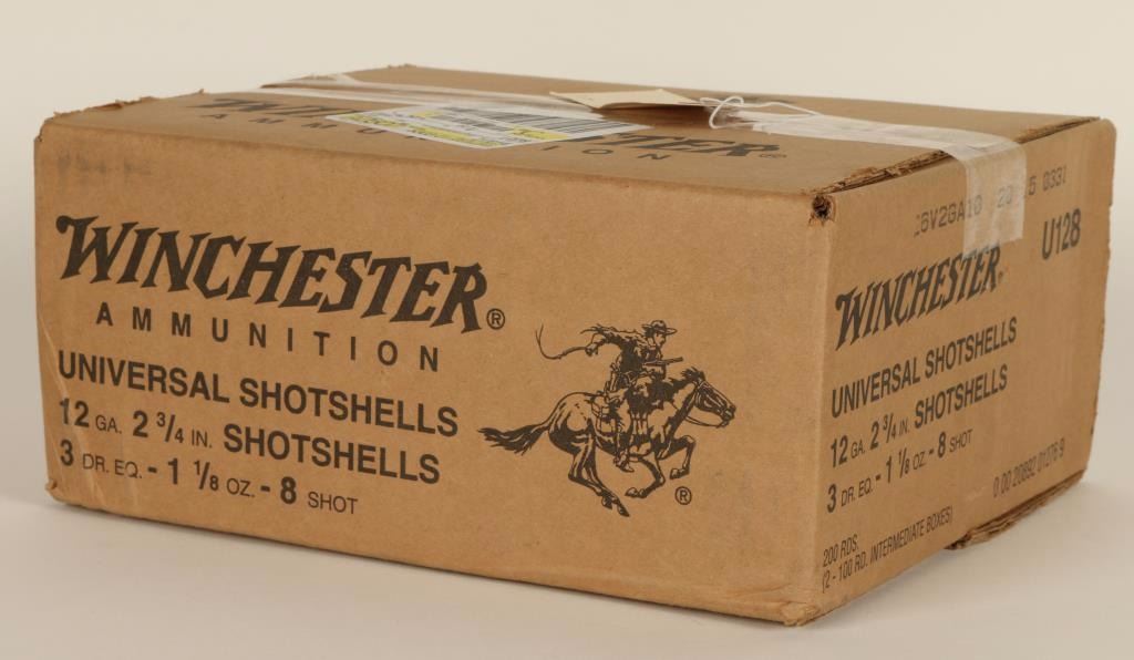 Consisting of one full case of 200 Winchester Universal 2 3/4" 1 1/8 ounce 8 shot, shells.