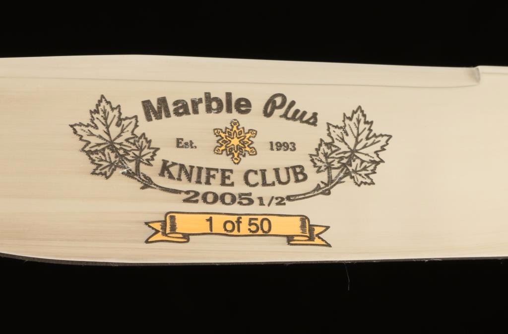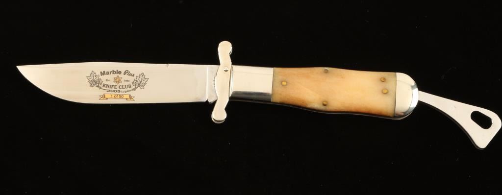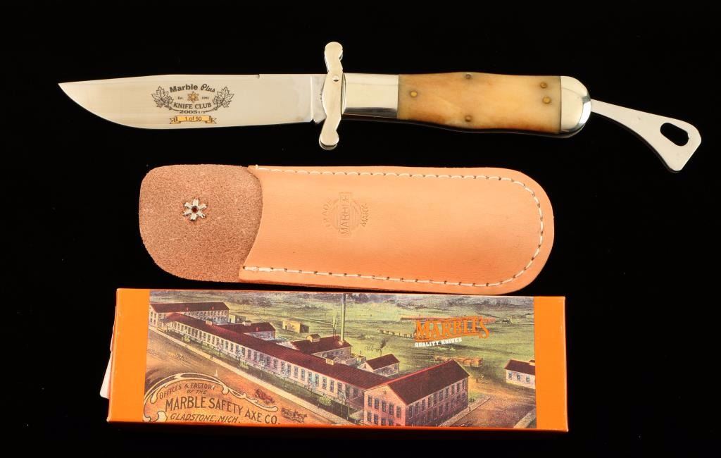 Polished antler handle, measures 9.5" overall with a 4.5" blade which reads "Marble Plus Knife Club 2005 1/2" 1/50. Includes leather sheath in original box. Excellent condition.