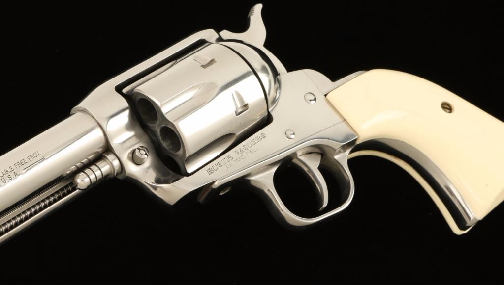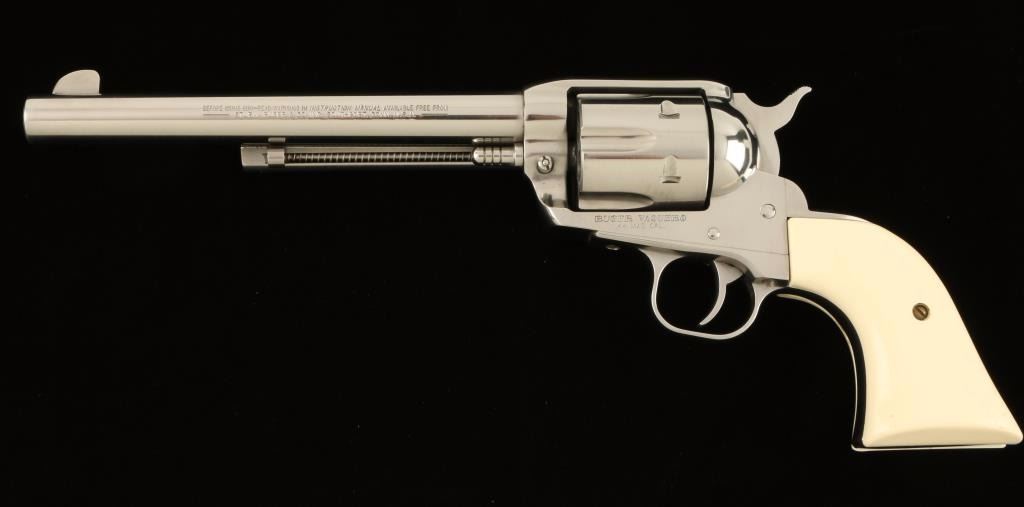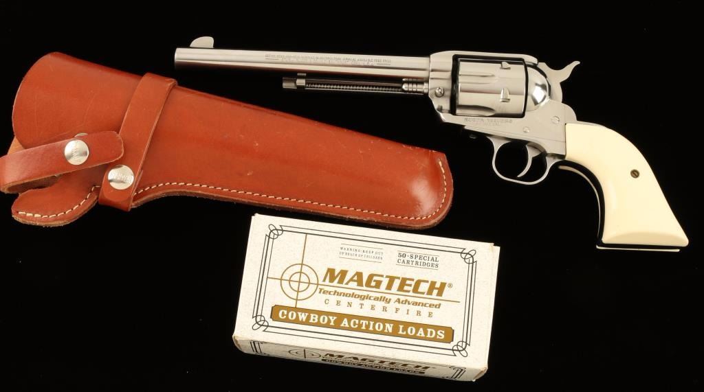 Stainless steel single action revolver chambered in .44 Magnum. Features a high polished finish, 7.5" barrel, ejector rod, blade front sight, notched rear sight, serrated hammer spur, transfer bar safety, fluted six shot cylinder, smooth trigger, and Ajax faux ivory grips. Includes a Hunter brown leather belt loop holster and one 50 round box of Magtech Cowboy Action Load 240 grain lead flat nose ammunition. Polished finish show moderate handling and holster wear with tiny superficial scratches. Action is smooth, bore is very good and grips are good with cracks from over-tightening. Condition is very good. ***Modern Firearm***