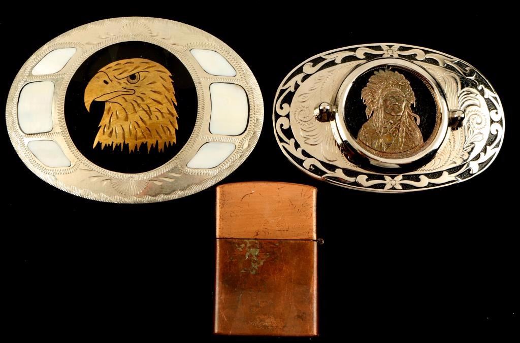 Marlboro Copper Case Zippo Style lighter, Johnson & Helo Nickel Buckle with Brass Eagle, and a Western Buckle with a Indian Cheif design.