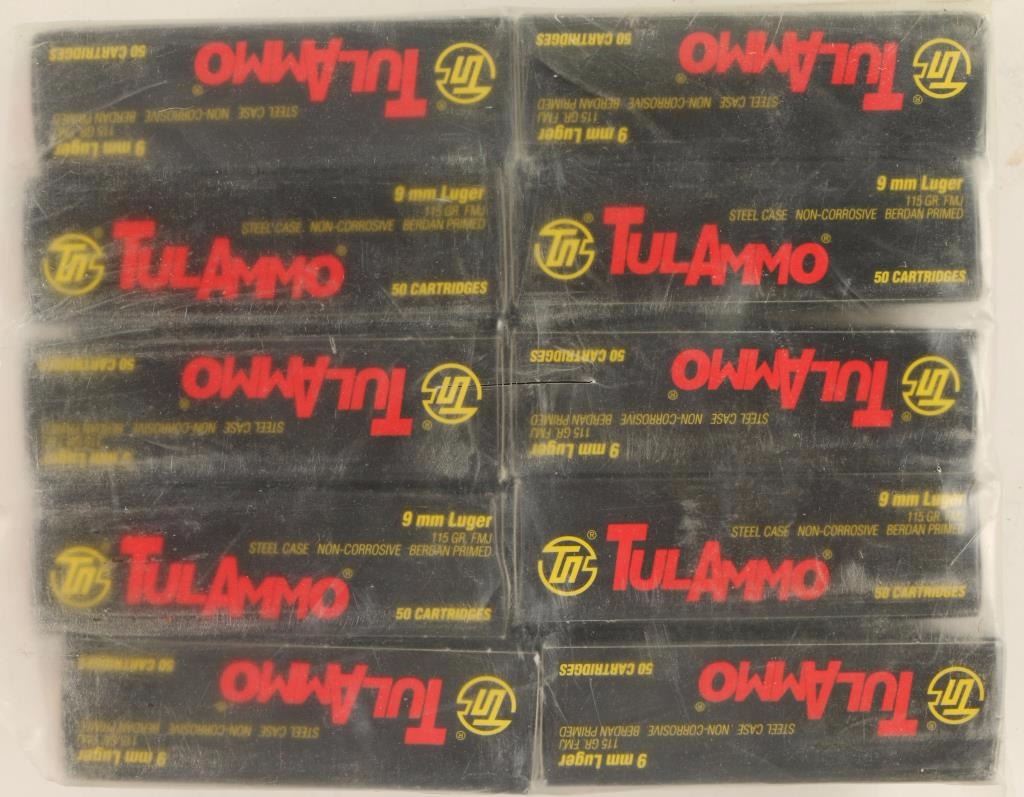 Consisting of ten 50 round boxes of Tula steel case 115 grain full metal jacket ammunition.