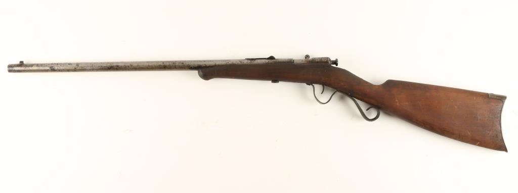 Blued bolt-action single shot rifle with a 21" round barrel, elevation adjustable rear sight, cracked and repaired wood stock and steel crescent buttplate. Bluing has worn away to leave mottled rust freckles and silver steel with pin-prick pitting. The trigger guard ahs been bent/modified. The bore is frosty with little rifling remaining. Action works but is stiff. Wood stock has had at least 3 repaired cracks, is missing a large chip from the front of the forend and a small chip from the toe of the butt. The butt plate has streaks of color with silver metal. Condition is poor. *Modern Firearm*