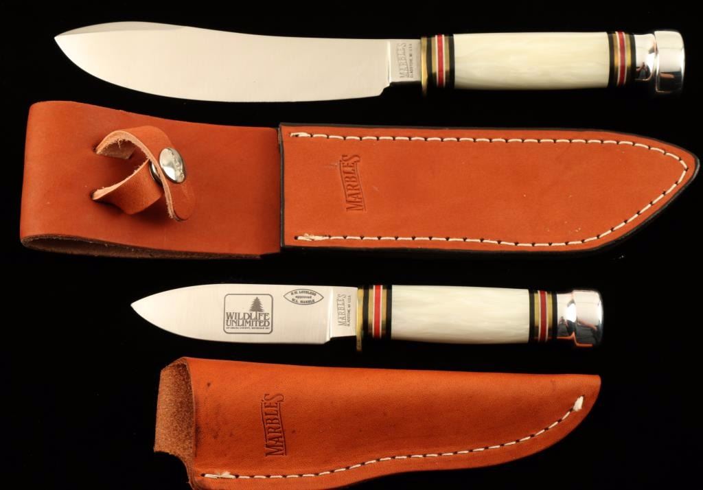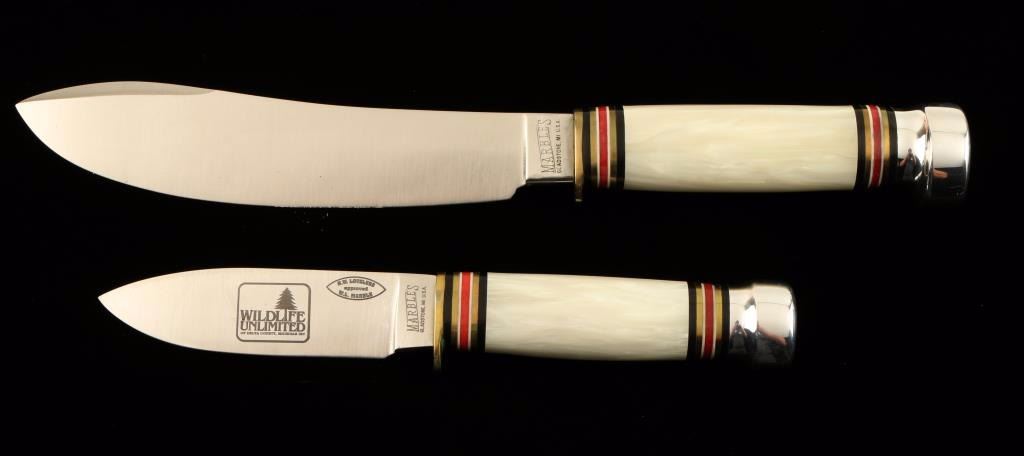1 Sport 99 with faux mother of pearl handle, etched blade reads "Wildlife Unlimited". Measures 7.5" overall with a 3.5" blade. 1 Northwoods Big Game Skinner, measures 10.5" overall with a 5.5" blade. Leather sheaths and original boxes. Excellent condition.