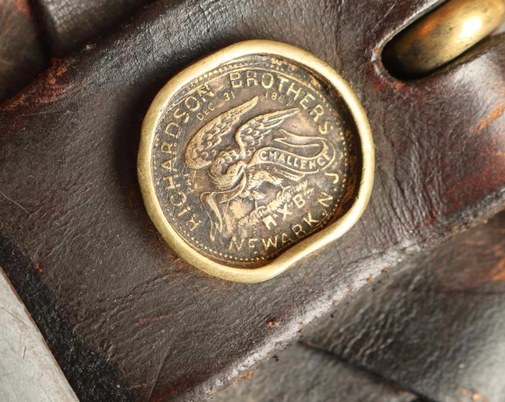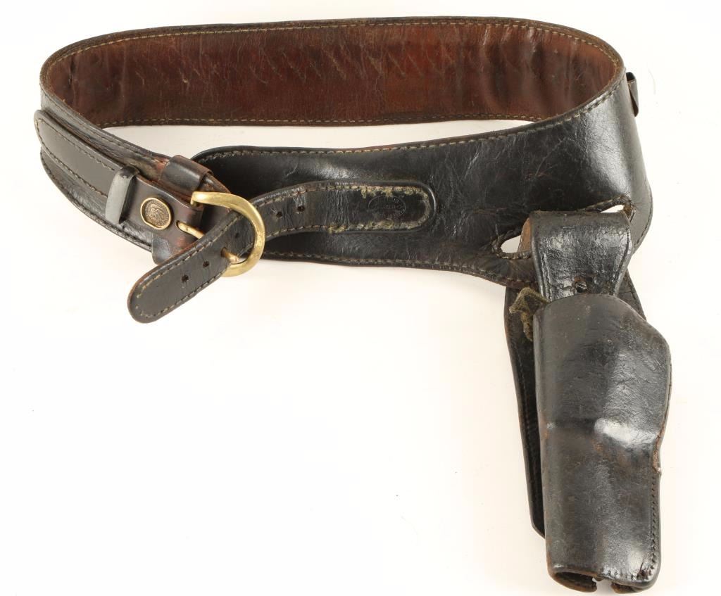 Single rig, smooth brown leather, holster is made by the Western Saddlery Shop, Tampa, Florida. Belt is stamped 'La Flair Cochise, AZ'. Brass buckle with a coin marked "Richardson Brothers, Newark, NJ'. For a Colt SAA 4 3/4.