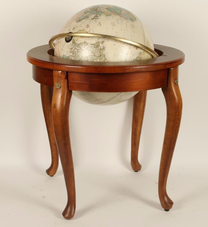 Oak stand with curved legs finished with a small brass flower medallion at the top. Removable globe with brass hardware rests inside. Measures 30"h x 25" dia. Perfect for the distinguished office or sitting area.