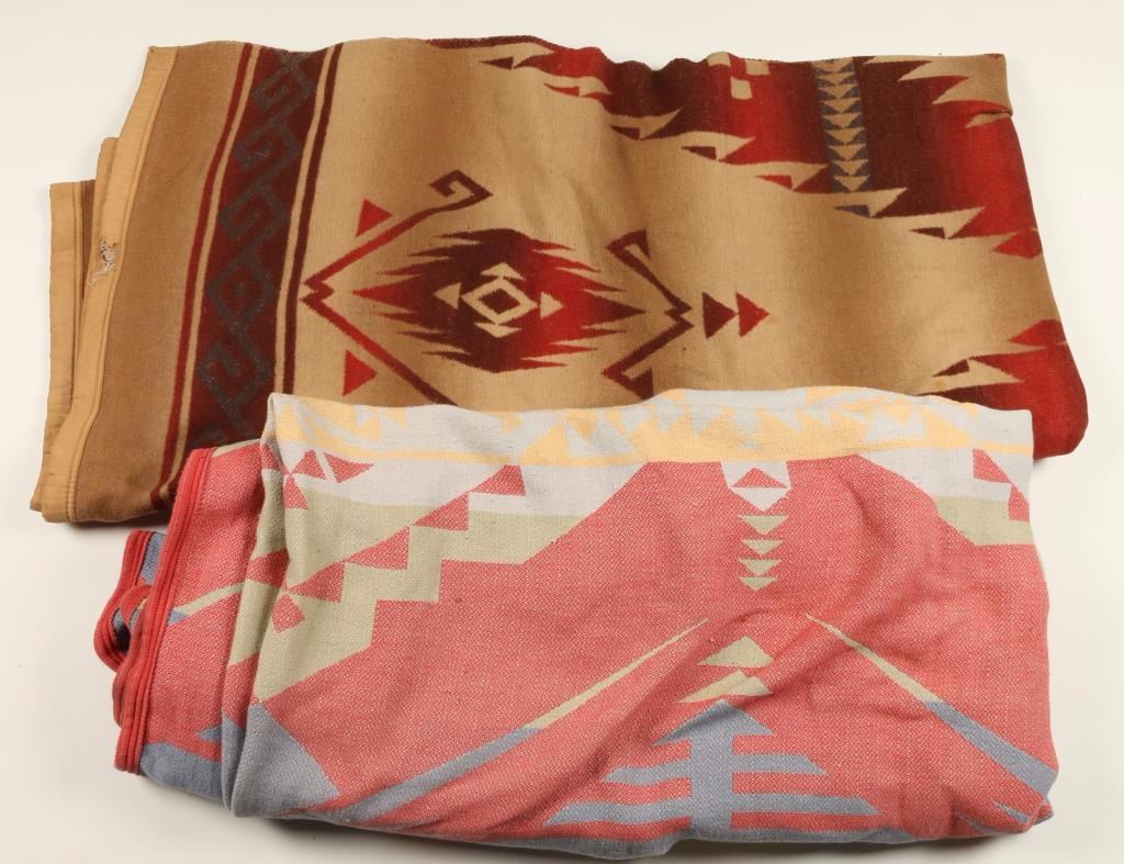 Coverlet is constructed of cotton and has a geometric Indian pattern in green, blue, tan and red. Wool camp blanket also has a Southwest pattern in tan, brown, blue and maroon.