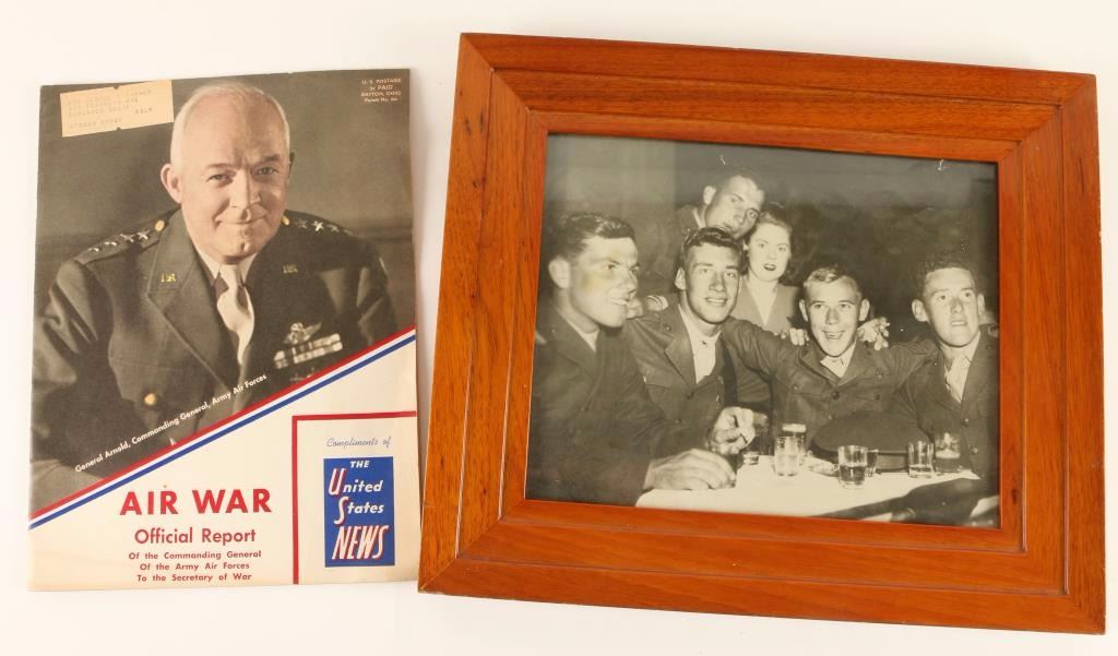 Including; Air War Official Report-General Arnold on cover and a black & white photo of military men at a celebration in wood frame.
